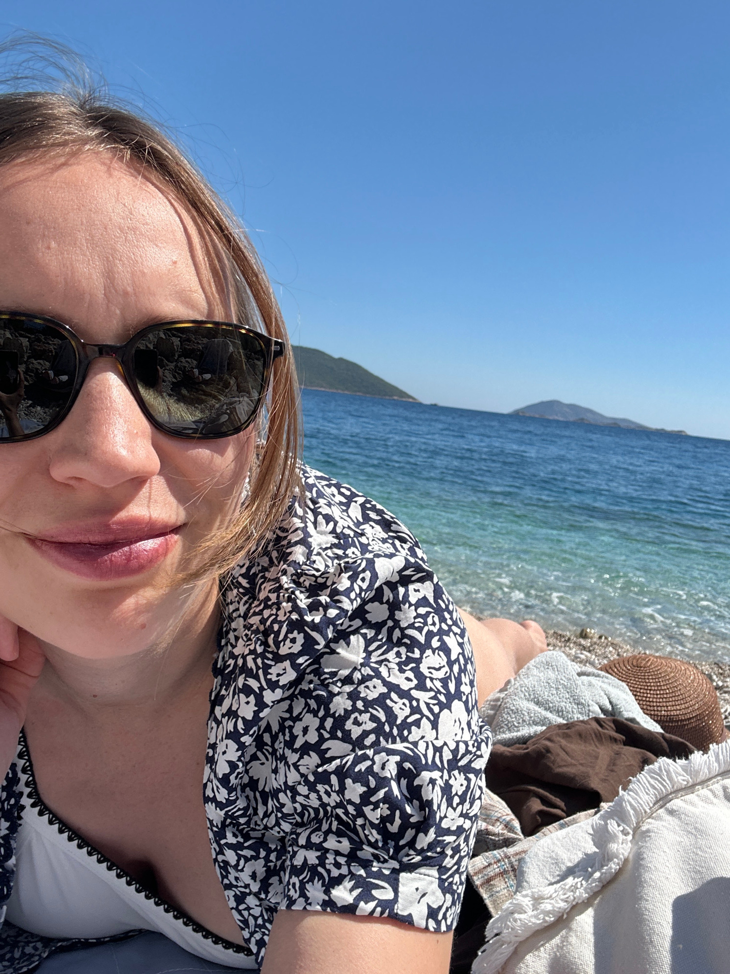 A woman wearing sunglasses and a blue-and-white floral-patterned dress is lying on a beach in Kaş, Turkey. The turquoise sea laps at the shore in the background, and a mountain is visible in the dista…read more