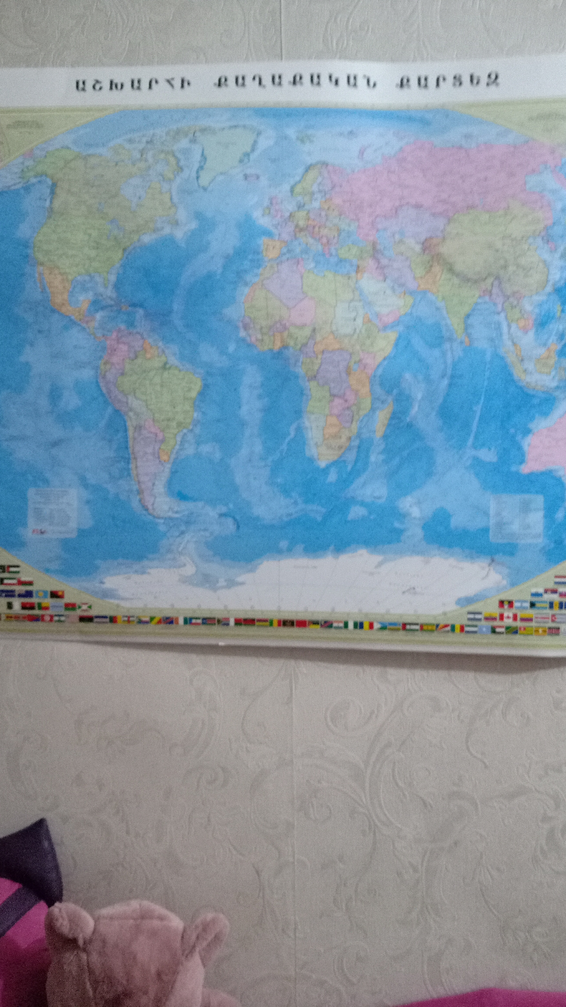 The image shows a world map hanging on a wall with patterned wallpaper. The title of the map, written in Armenian, appears to be "WORLD POLITICAL MAP". Below the map is a row of flags representing var…read more