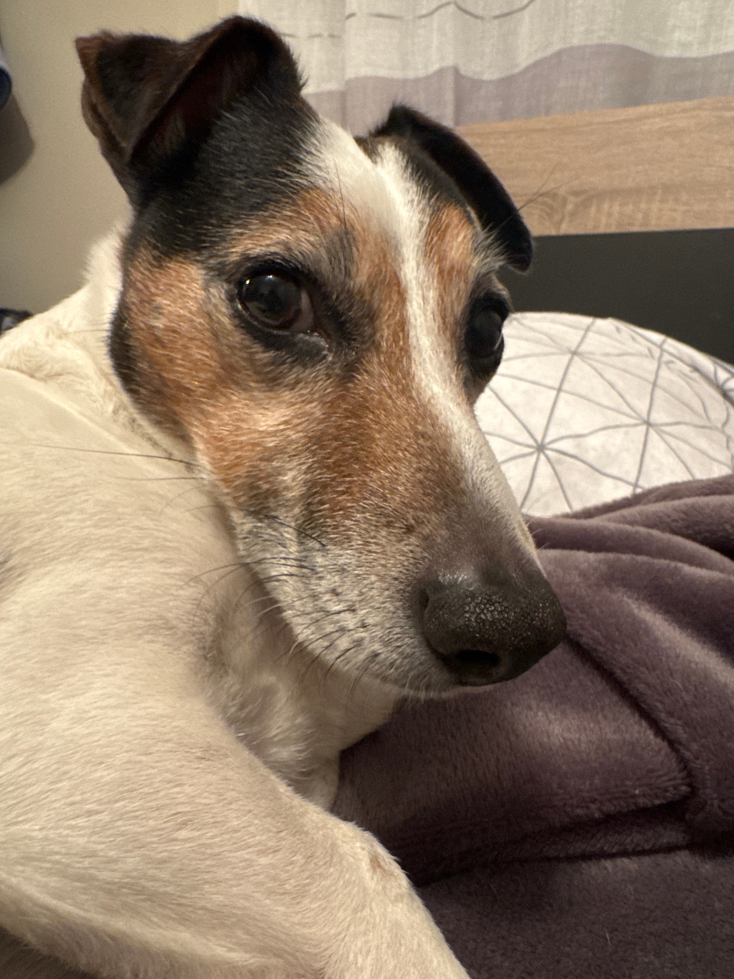 The image shows a close-up of a dog's face. The dog has a predominantly white coat with brown and black markings on its head and ears. Its nose is black and shiny, and its eye is dark and reflective.…read more