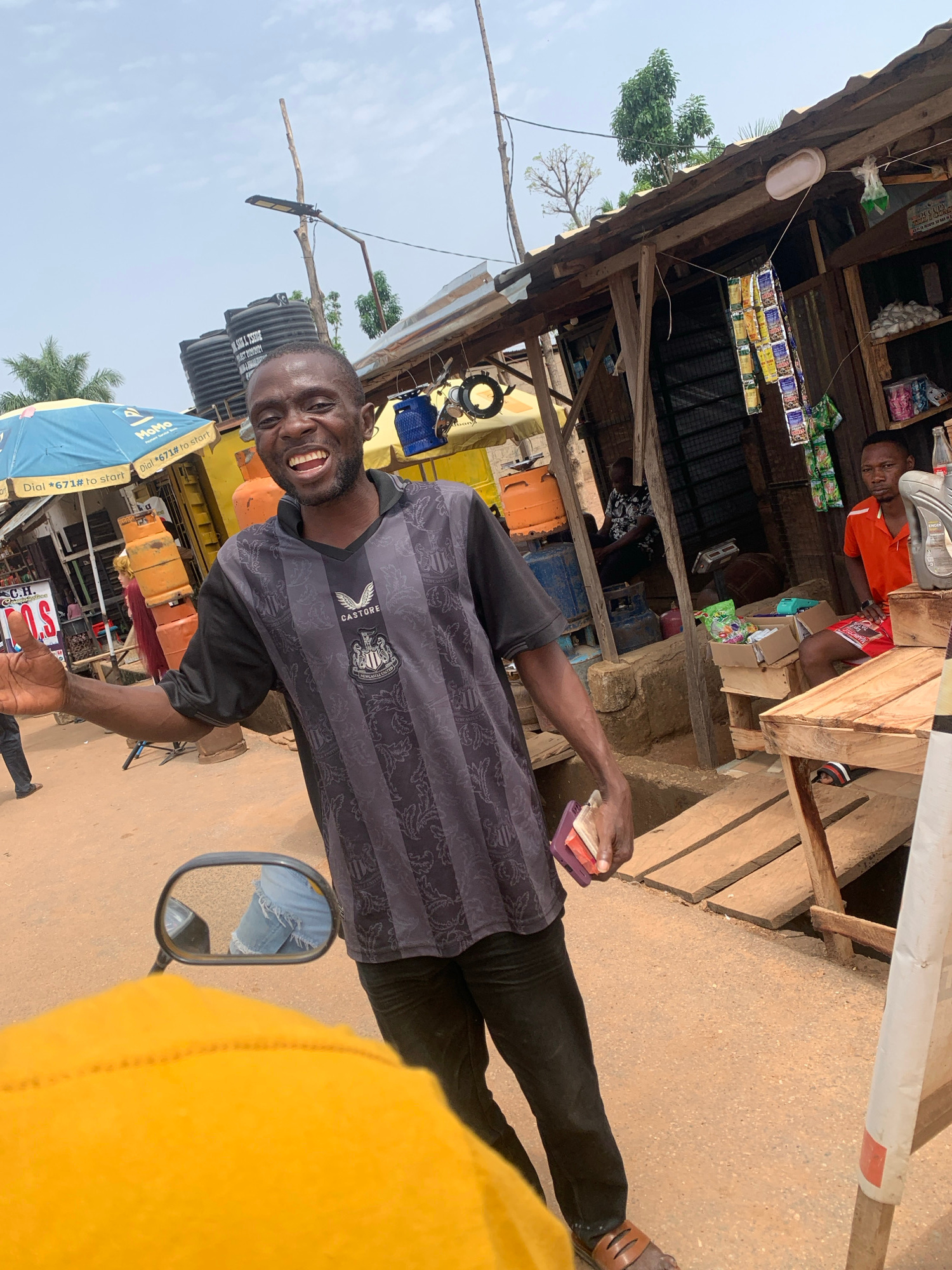 The image captures a scene in Akwanga, Nigeria. A smiling man wearing a black and grey Newcastle United soccer jersey stands in the street. He's holding a purple phone case and several small, possibly…read more