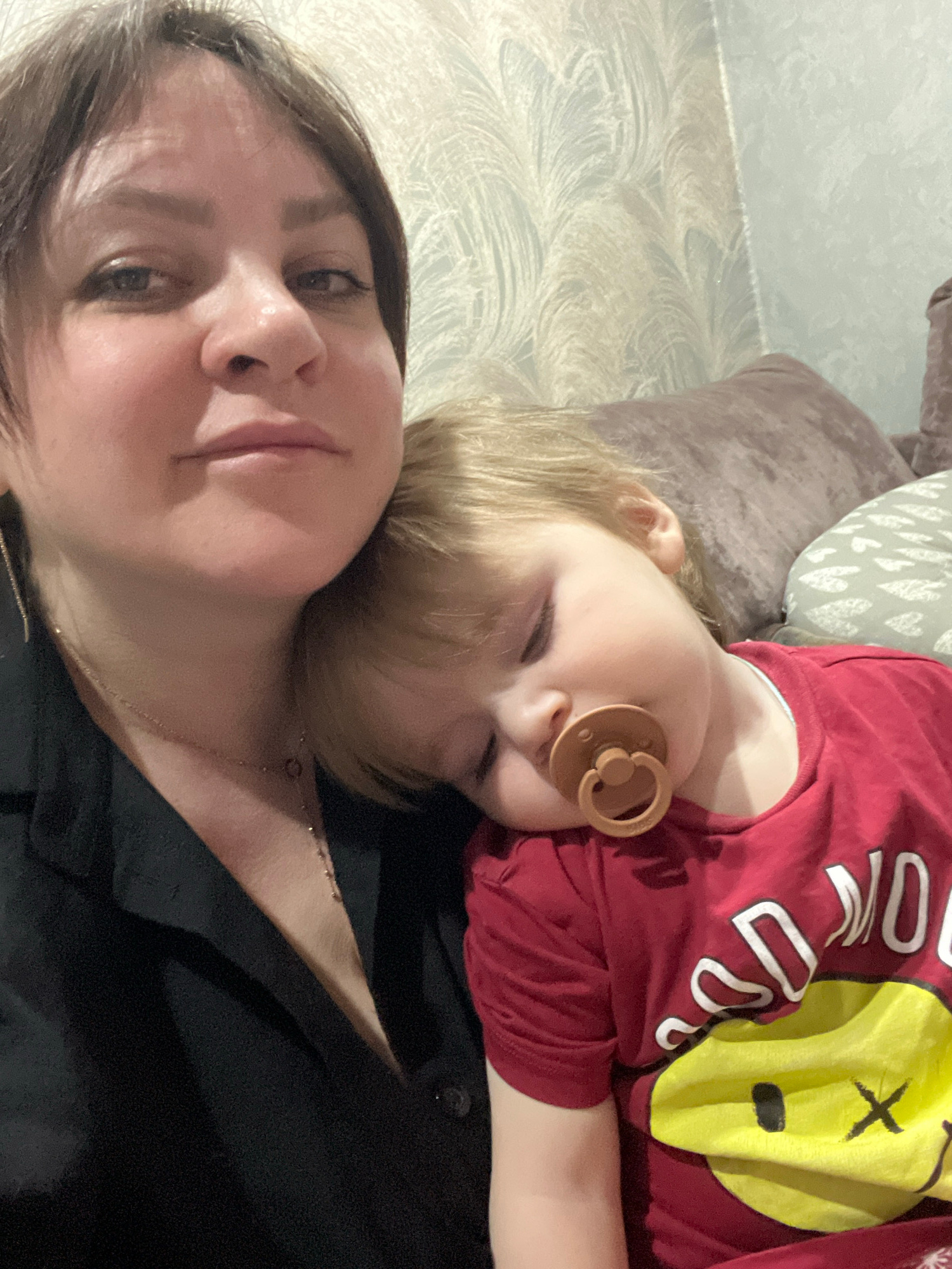 A photograph depicts a woman and child lying on a couch. The child, wearing a red t-shirt with a yellow graphic and a pacifier, is asleep on the woman's chest. The woman is wearing a black shirt and a…read more