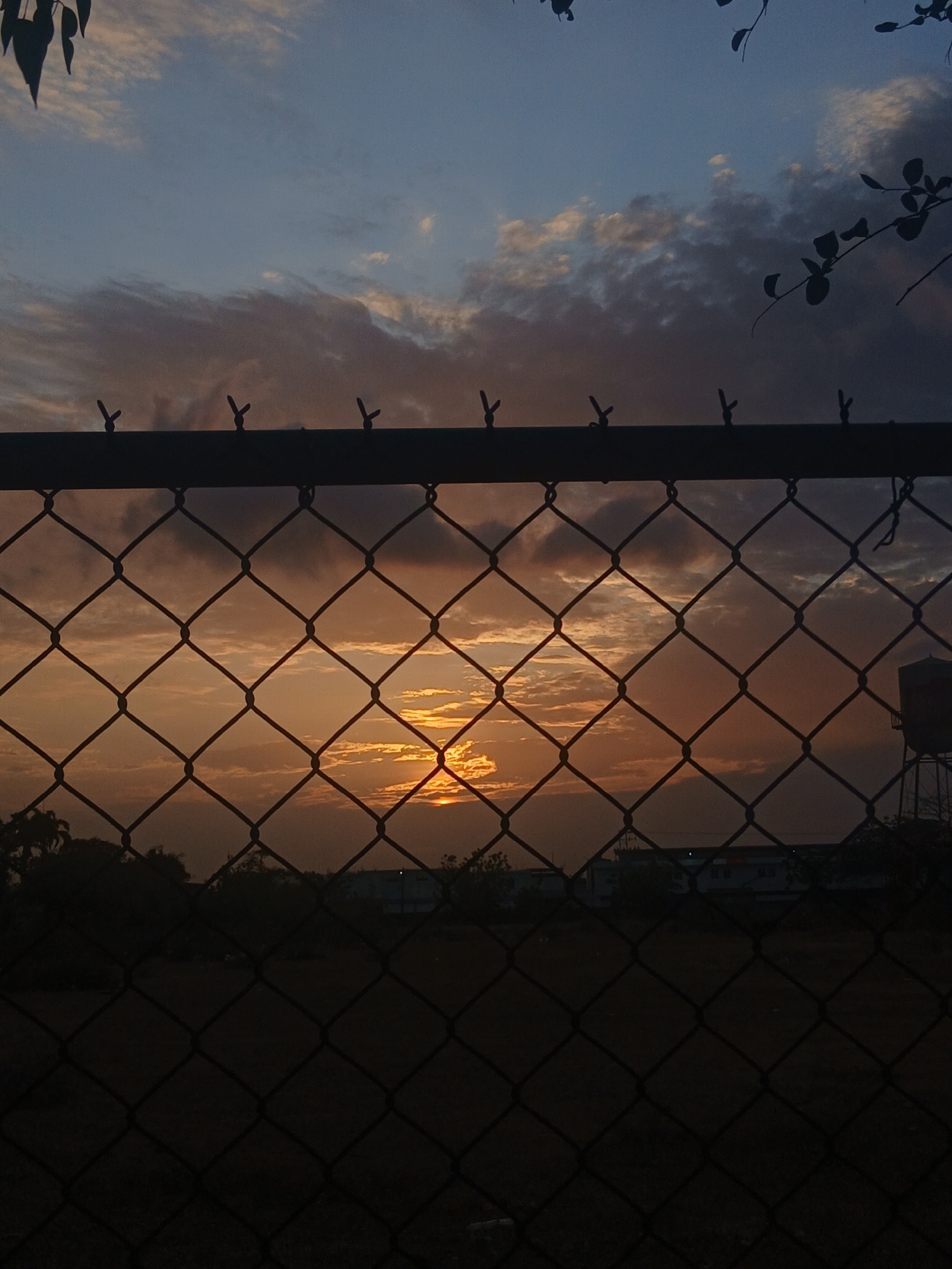 The image captures a sunset sky seen through a chain-link fence. The sky displays a gradient of colors, from blue with clouds on the left to orange and yellow where the sun appears to be setting. Sunl…read more