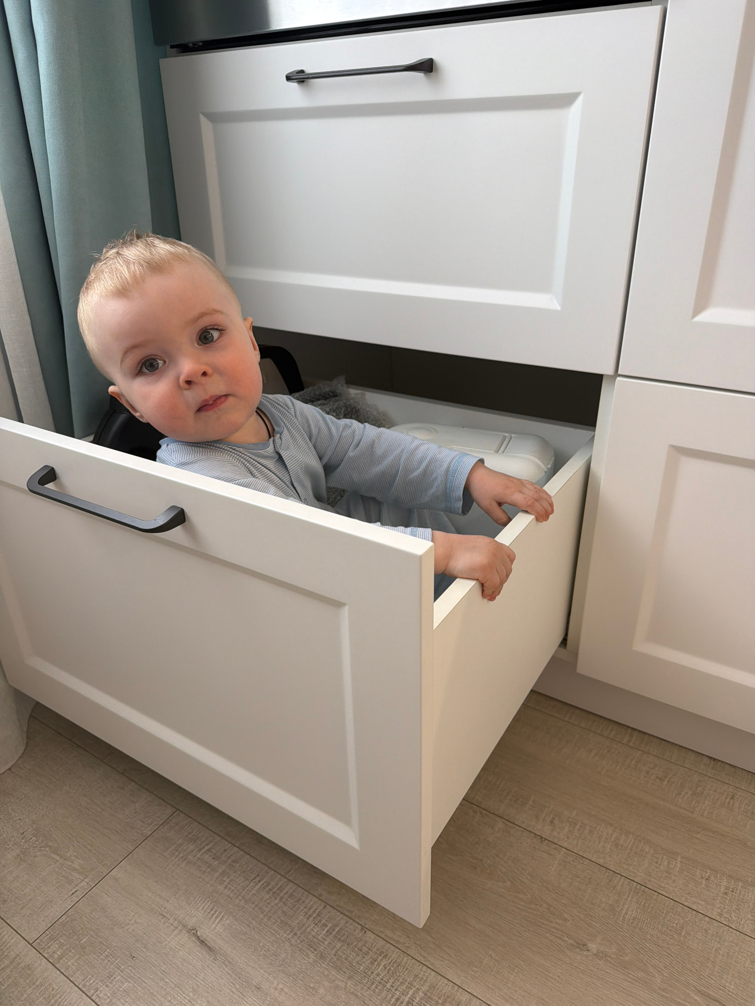 A toddler is partially inside an open white cabinet drawer. The drawer is open, and the child is visible from the chest up. The child has blonde hair and is wearing a light blue and white striped shir…read more