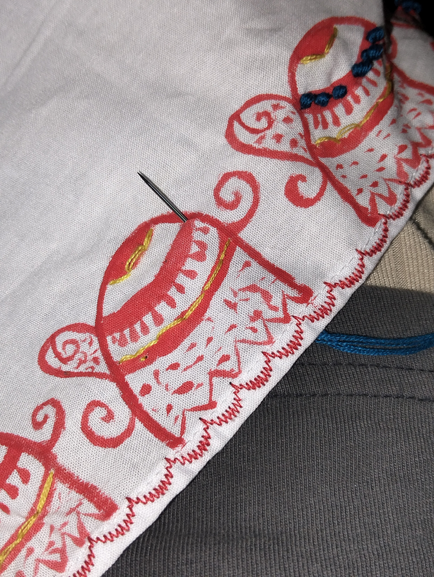 A close-up shows a white piece of fabric with red and gold embroidery lying on top of a gray piece of fabric. A needle is inserted into the white fabric. The style of the embroidery suggests South Asi…read more