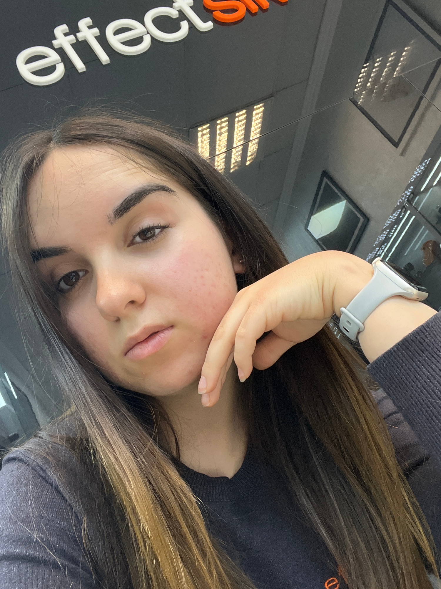A close-up selfie shows a young woman with long, highlighted brown hair posing with her hand near her face. She is wearing a dark-colored top and a light-colored smart watch. The photo appears to have…read more