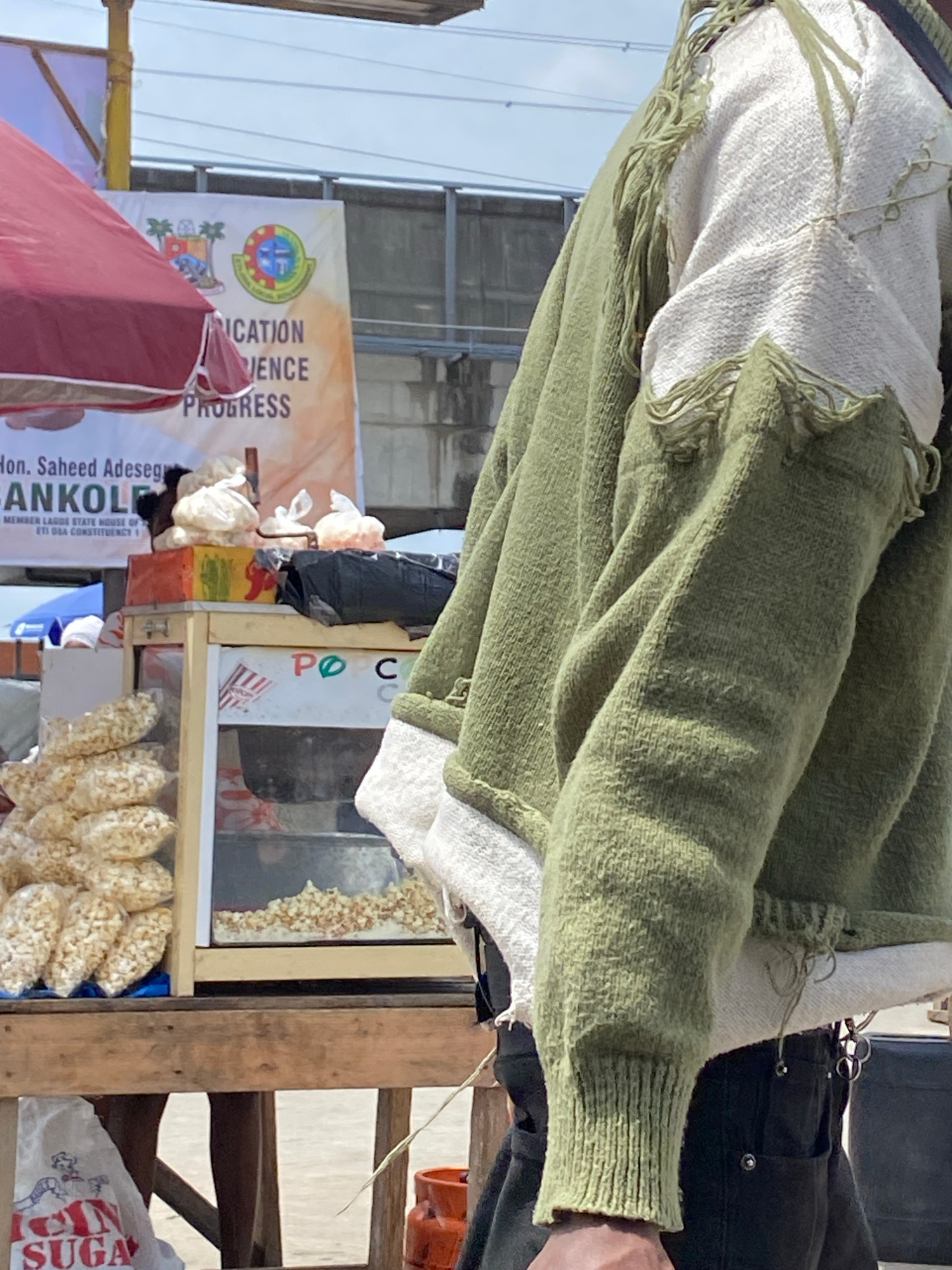 The image shows a person wearing a green sweater over a white top. The person is positioned near a popcorn stand in what appears to be Lagos, Nigeria. The stand includes a sign that reads "POC", and i…read more
