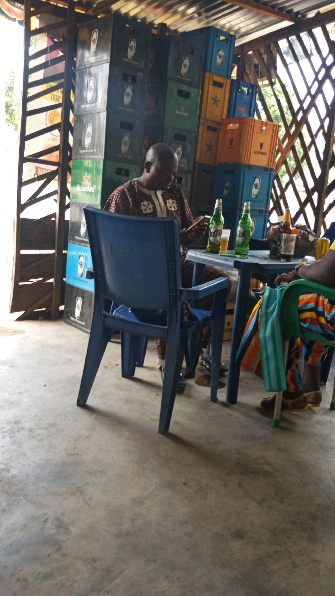 A low-angle, medium shot captures a casual scene in Zango-ndaji, Nigeria. A dark-skinned, bald man in a patterned brown and white shirt sits at a blue plastic chair and a blue plastic table. He is loo…read more