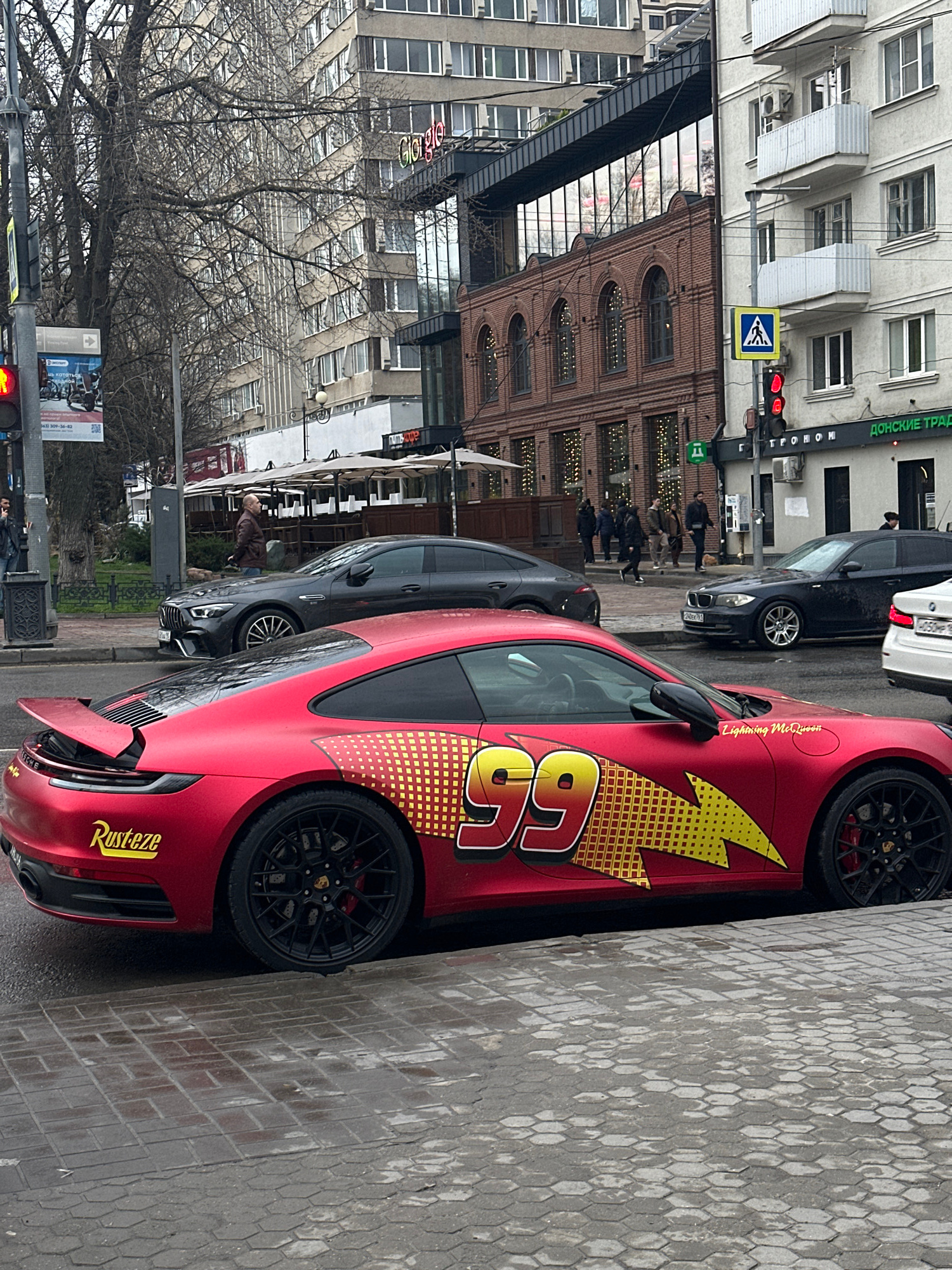 The image depicts a red Porsche 911 adorned with "Lightning McQueen" branding, including the number 95 and "Rusteze" logo, parked on a wet city street. The location appears to be in Rostov-on-Don, Rus…read more