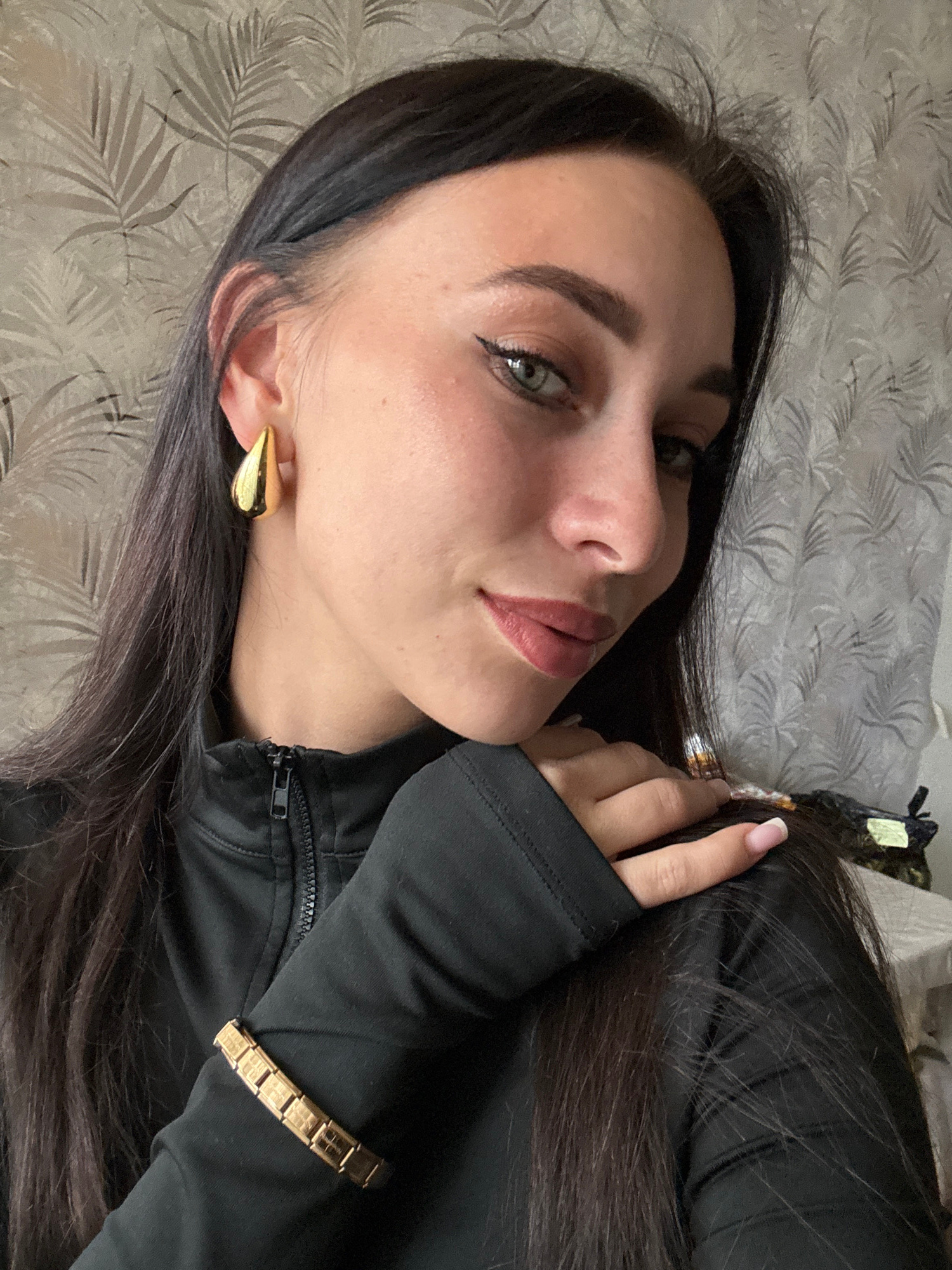 An indoor portrait shows a young woman, likely in her 20s or early 30s, looking directly at the camera with a calm expression, hinting at a subtle smile. She has long, dark brown hair, light-colored e…read more