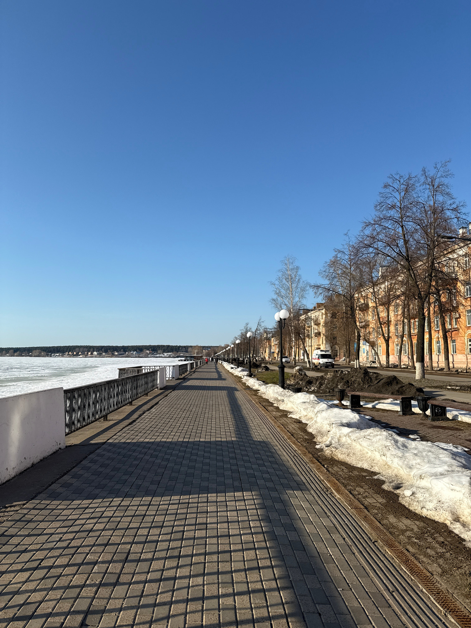 The image shows a paved walkway along a riverfront in Votkinsk, Russia. The walkway is made of gray, rectangular paving stones and runs along a white concrete barrier overlooking the frozen river. Onβ¦read more