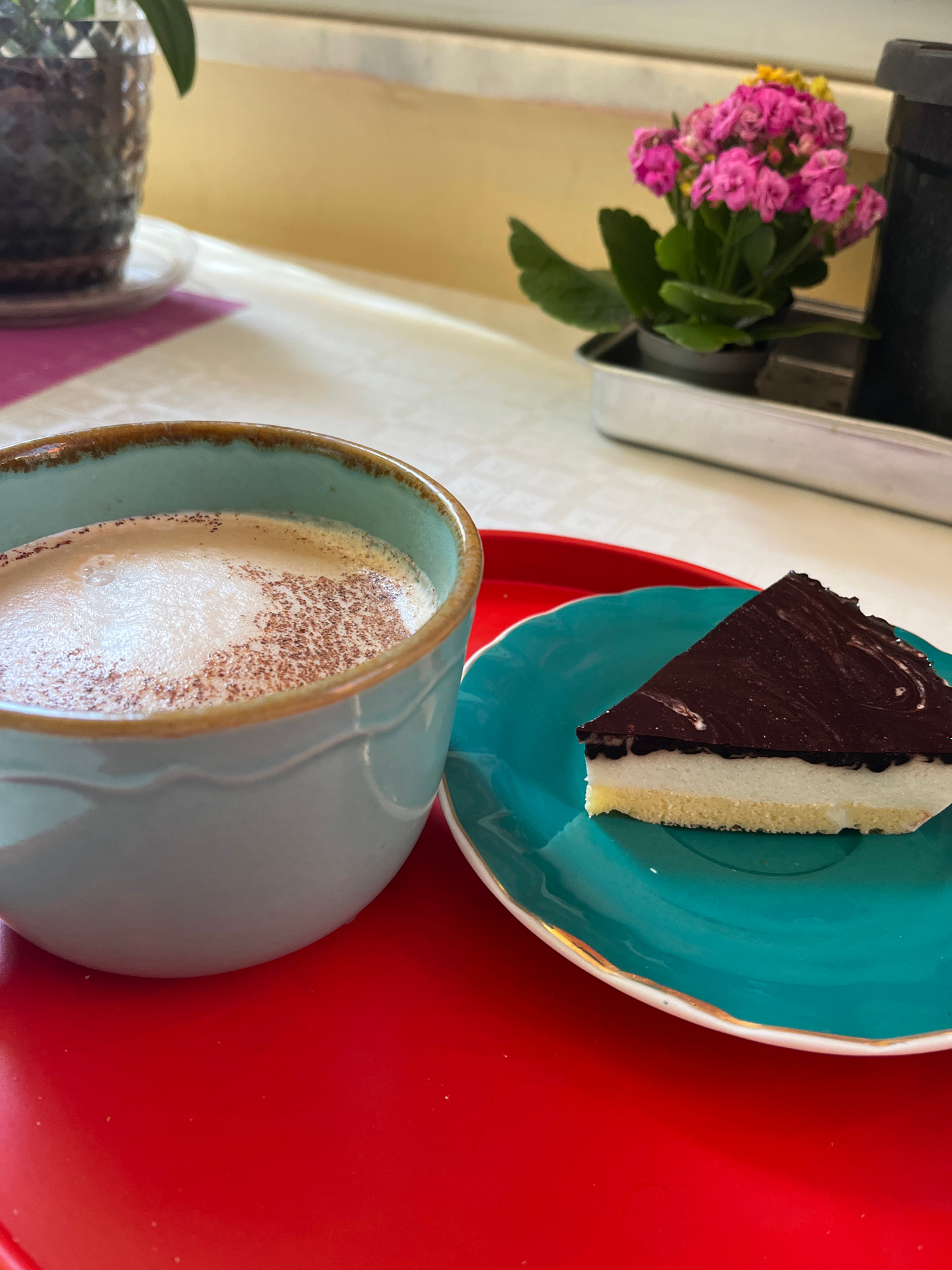 The image presents a close-up, high-angle view of a table setting. A light blue ceramic mug, partially filled with a foamy beverage sprinkled with brown powder (likely cocoa or cinnamon), sits promine…read more