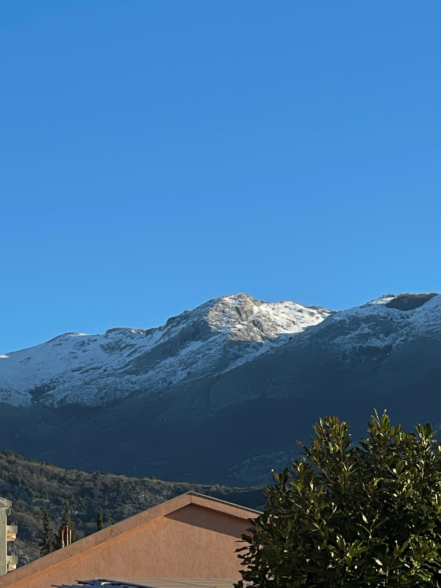 The image depicts a view of a mountain partially covered in snow, set against a clear blue sky. A building with a tan exterior and a tree with dark green foliage are situated on the right side of the…read more