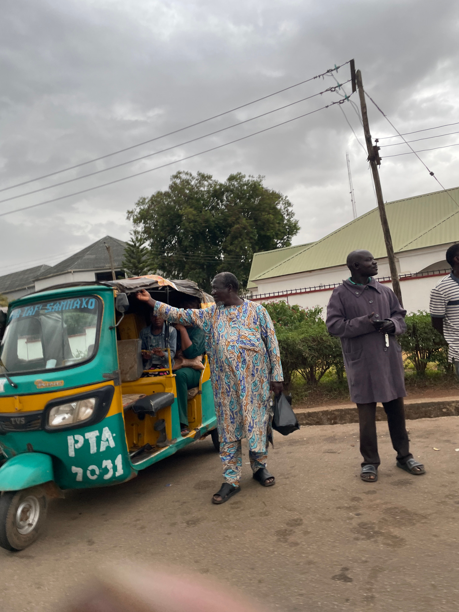 The image captures a scene in Jos, Nigeria. A three-wheeled vehicle, a "Keke Napep" or auto rickshaw, is prominently featured. The Keke Napep is painted in yellow and green and has the registration nu…read more