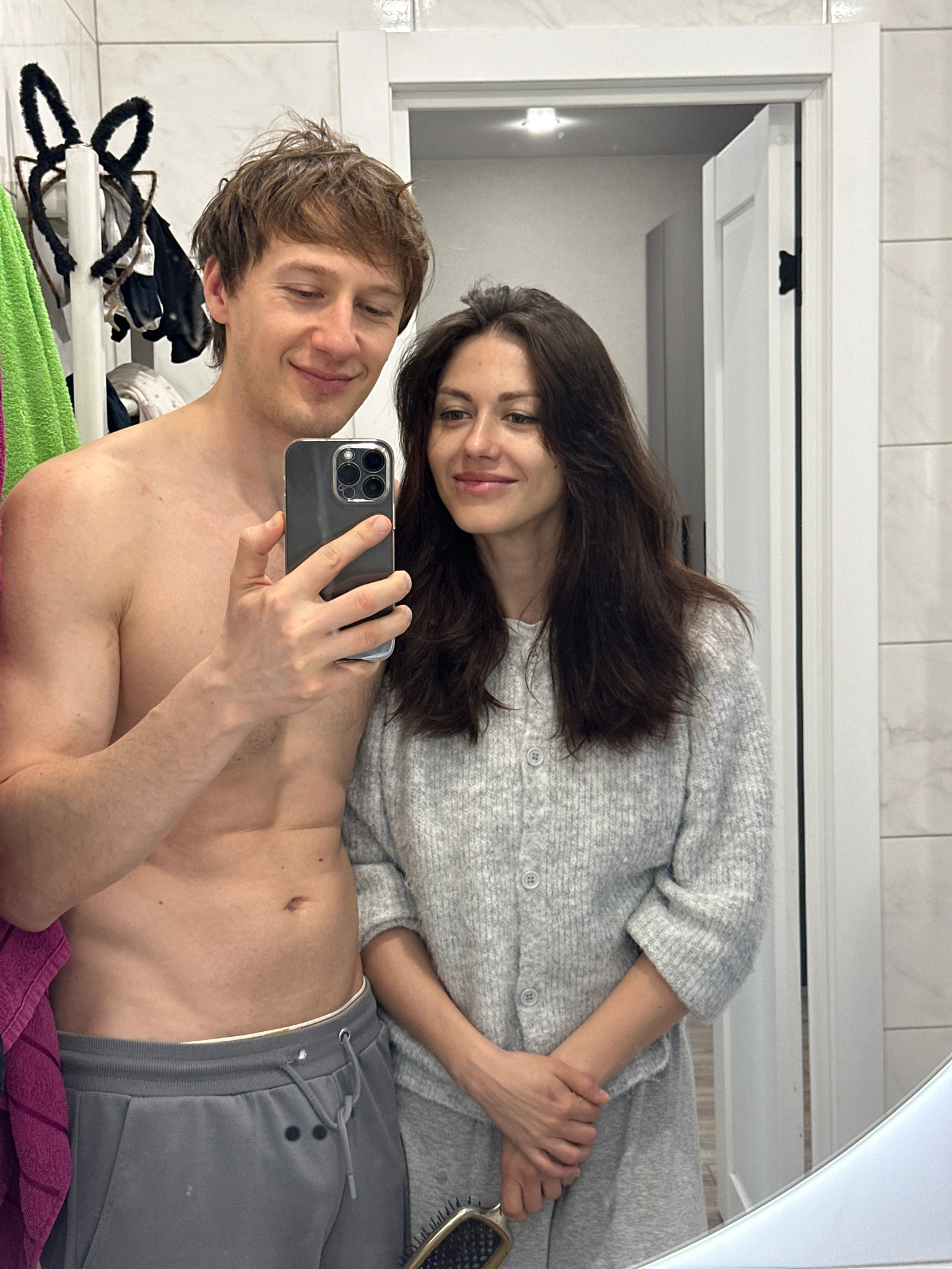 A couple is taking a selfie in a bathroom. The man is shirtless and wearing gray sweatpants. The woman is wearing a gray cardigan and matching pants. They are in a bathroom with white tile walls and a…read more