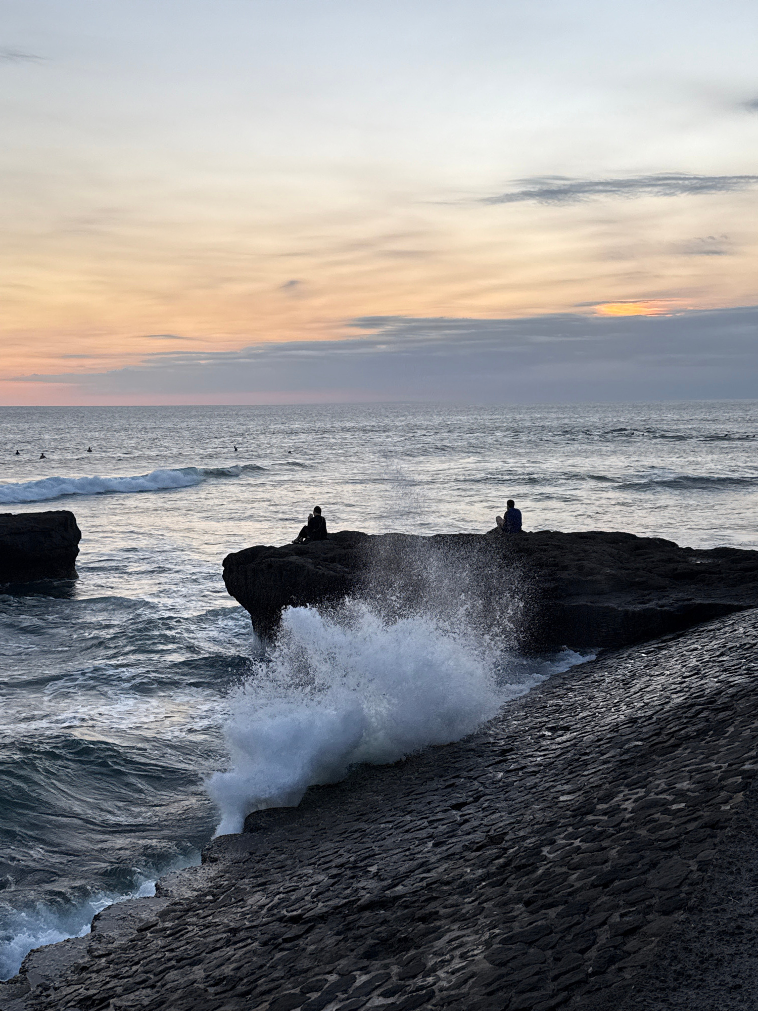 The photograph captures a seascape at sunset off the coast of North Kuta, Indonesia. The sun is setting, casting a warm glow on the sky, which transitions from light gray near the horizon to orange anβ¦read more
