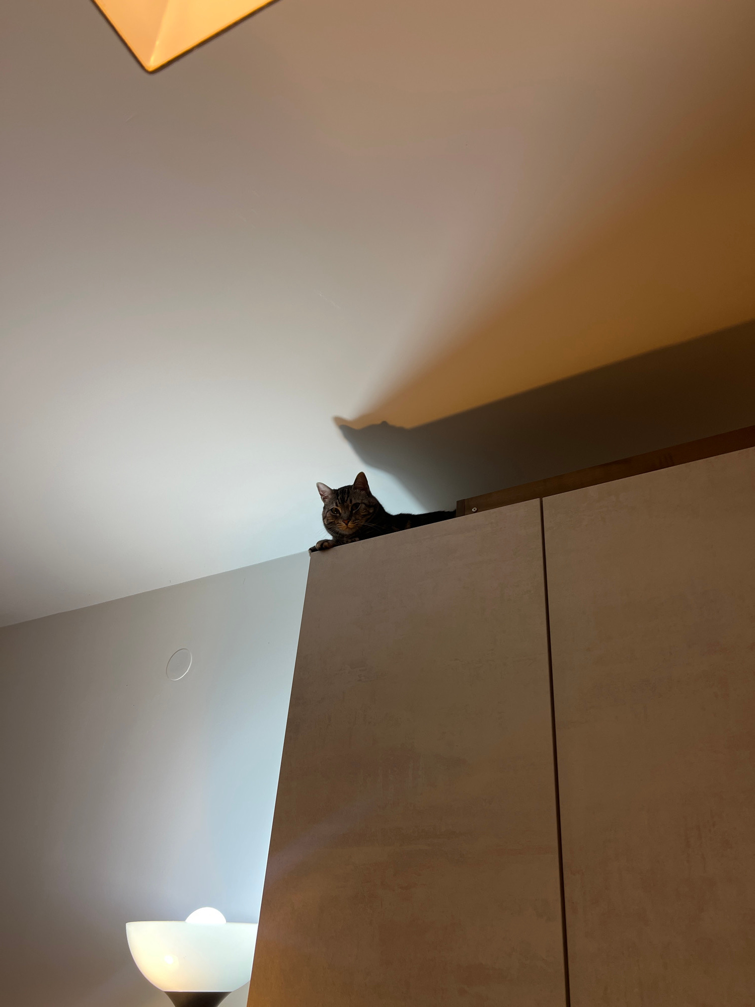 An indoor scene in Boreti, Montenegro, captured from a low angle, depicts a tabby cat observing from atop a light-colored, tall cabinet. The cat's head and front paws are visible, resting on the cabin…read more