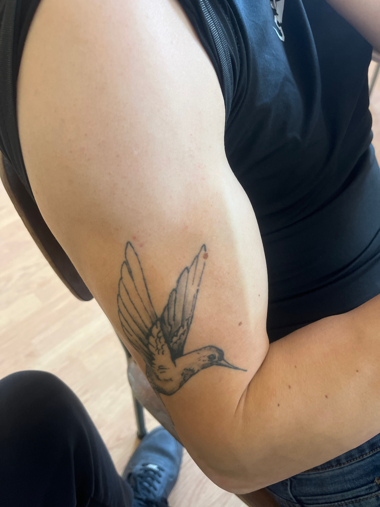 The image shows a person's left arm with a tattoo of a hummingbird. The arm is bent at the elbow and is positioned in the foreground of the image. The person is wearing a black t-shirt and denim jacke…read more
