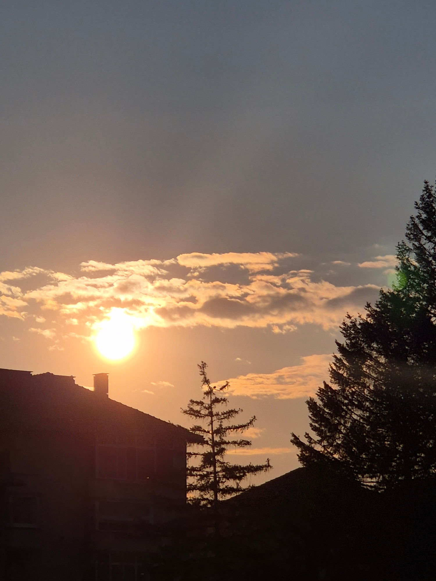 The image captures a serene sunset or sunrise scene in a residential or suburban setting, likely within Pavlikeni, Bulgaria. The photograph is oriented in landscape format, with the sun prominently fe…read more