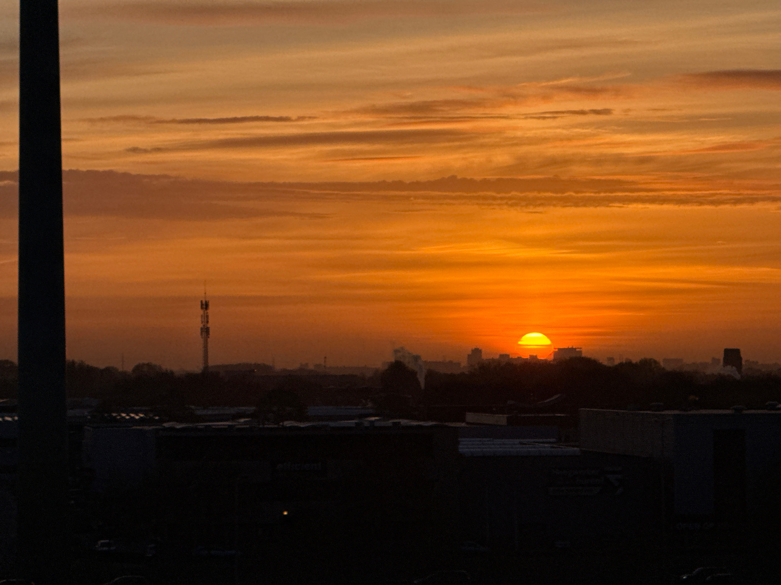 The image depicts a striking sunrise or sunset over an urban-industrial landscape, likely in Maasdijk, Netherlands, captured from an elevated vantage point. The sky is the most prominent feature, dispβ¦read more