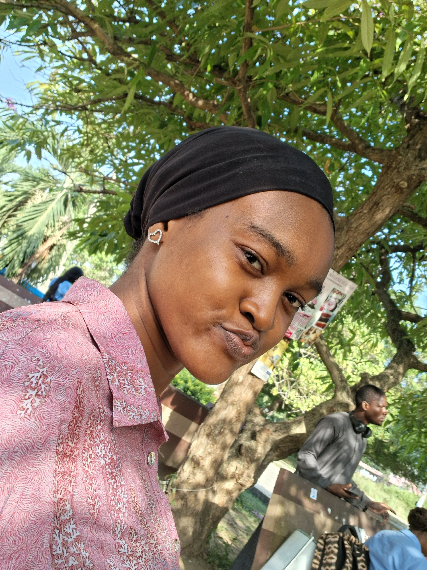 A woman wearing a pink patterned shirt and a black head covering is the primary subject of the image. She is positioned in front of a lush green tree with visible branches and leaves, with the blue sk…read more