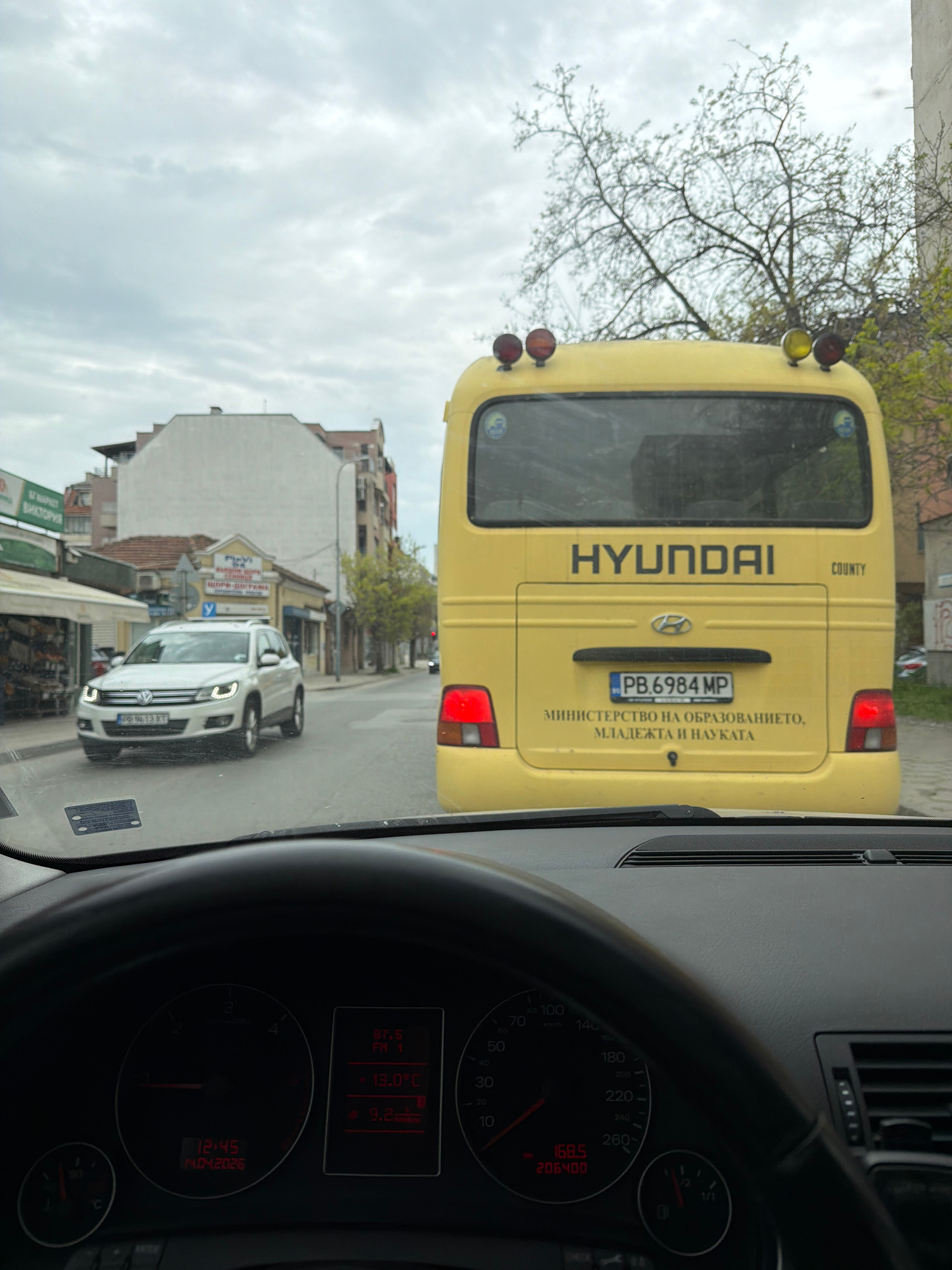A first-person view from inside a car shows a yellow Hyundai County bus, registration number PB 6984 MP, operated by the Ministry of Education, Youth and Science of Bulgaria, stopped in front. The bus…read more