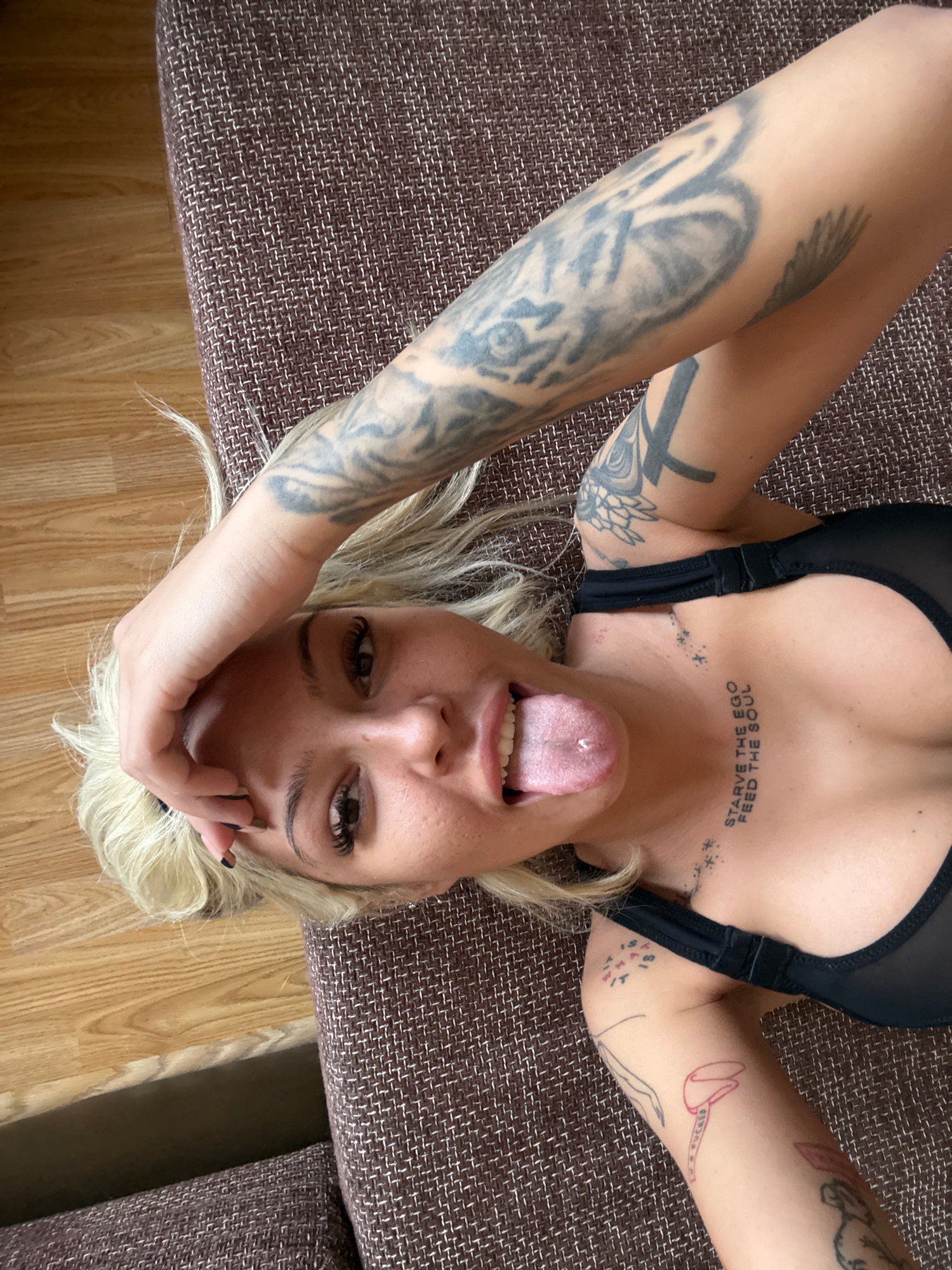 A woman lies on a brown woven-patterned couch with light wood flooring visible in the bottom portion of the image. She is facing upwards, with her head tilted back and her tongue extended. The woman wears a black top with thin straps. Tattoos are visible on both arms and across her chest, where the words "STARVE THE EGO FEED THE SOUL" are inked. She has blonde hair and long eyelashes. Her left hand is raised to her forehead. The location is Unknown, Unknown. | Open Wire