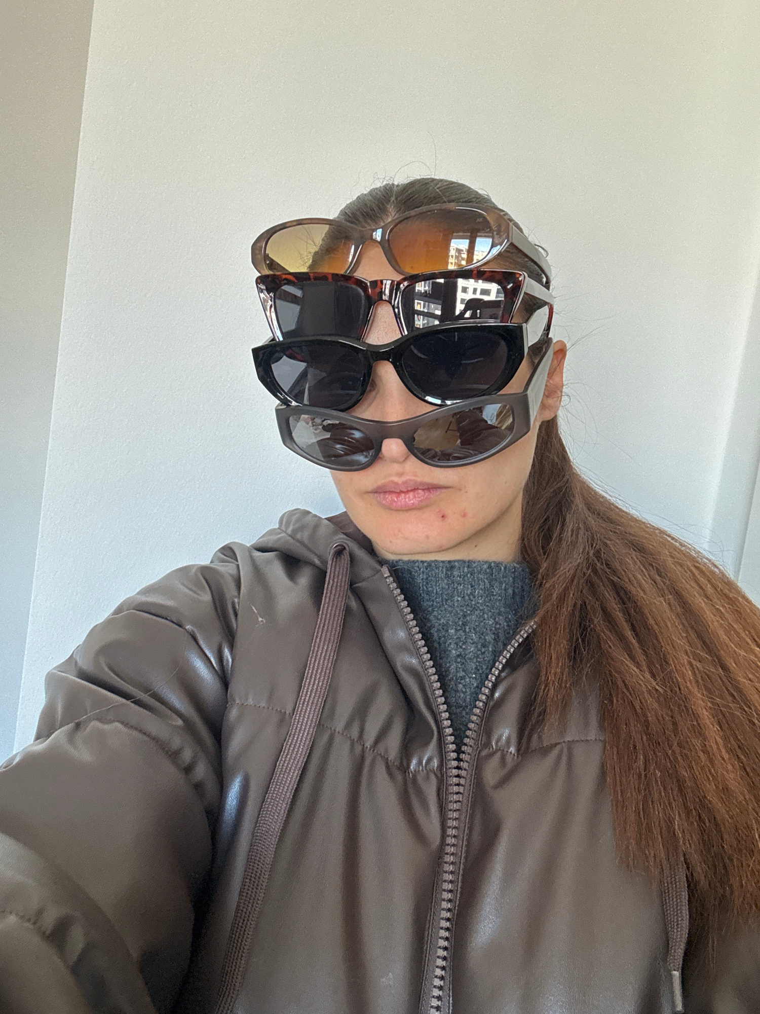 A person is positioned facing the camera, with their head tilted to the side. They are wearing a brown puffer jacket over a grey sweater. Multiple pairs of sunglasses are stacked on their head. The ba…read more