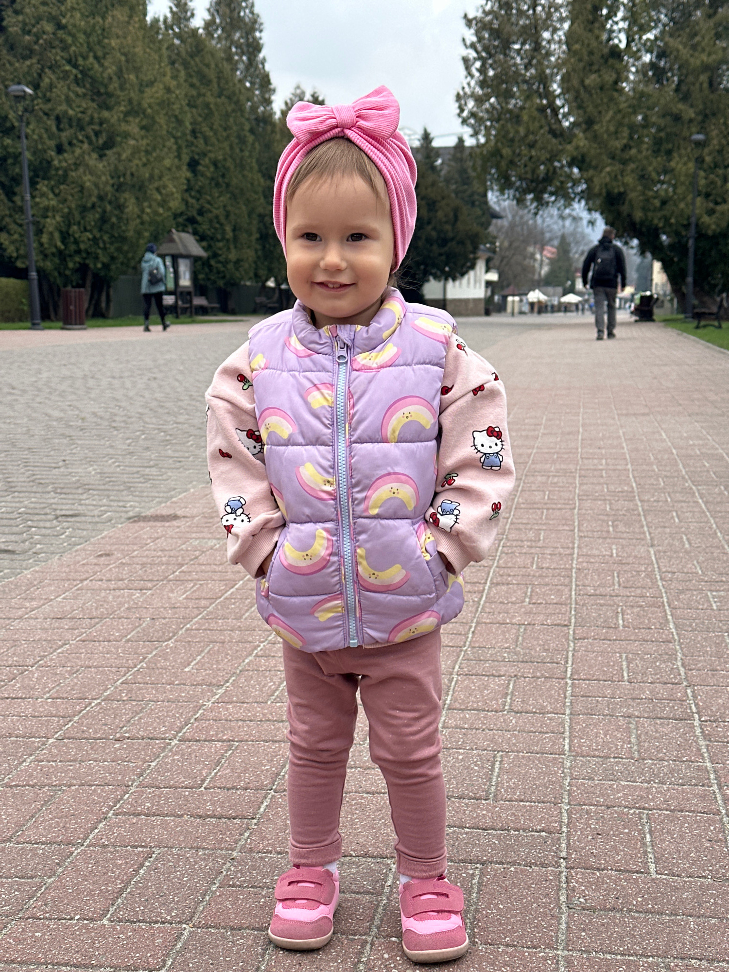 A young girl stands on a brick walkway. She wears a pink headband, a light pink top with Hello Kitty graphics, a sleeveless puffer vest with rainbow graphics, pink leggings, and pink shoes. The walkwa…read more