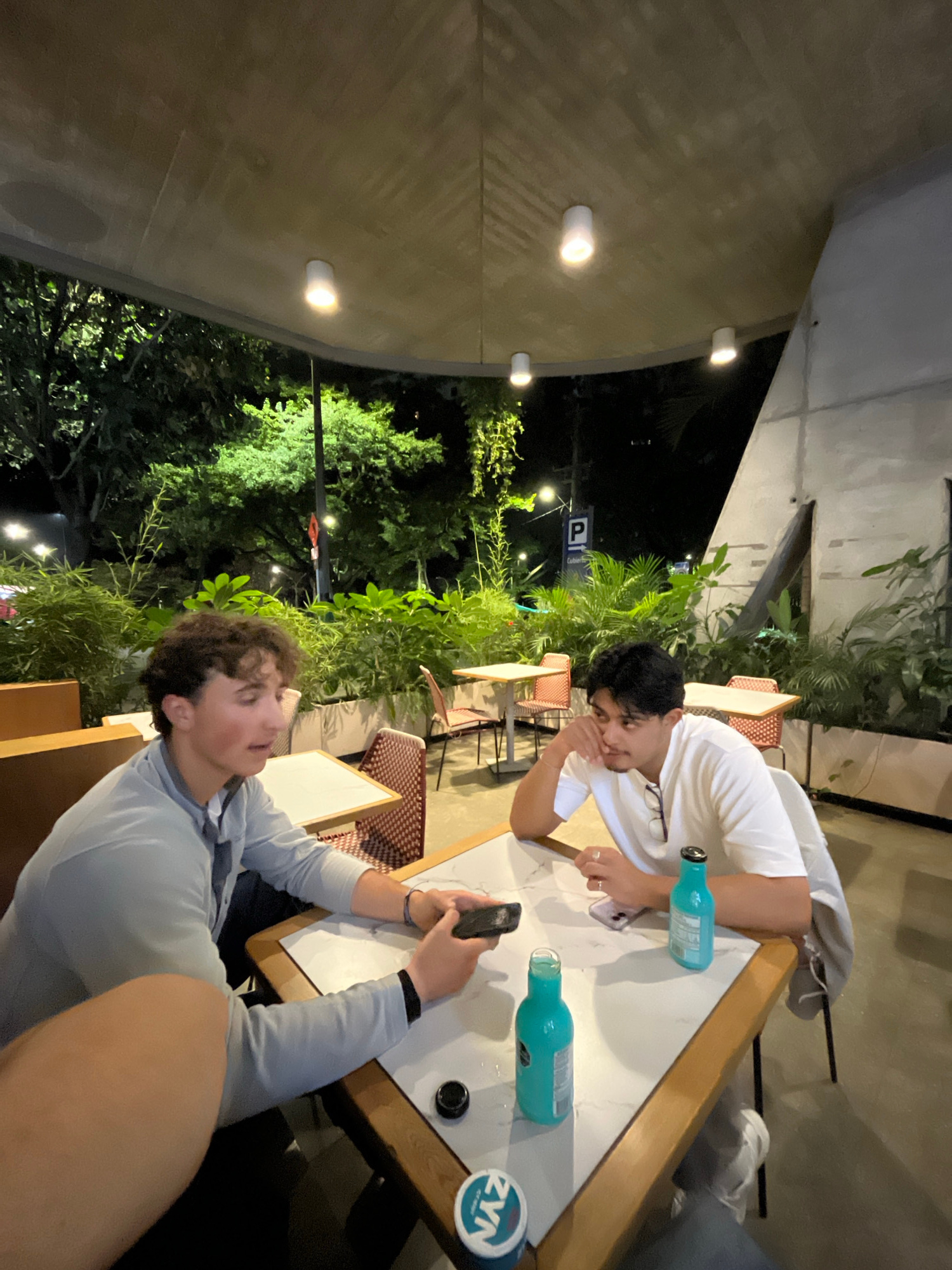 Two young men are sitting at a table outside, likely at a restaurant or cafe in Medellín, Colombia, based on the ambient lighting and vegetation. The man on the right is holding a smartphone, possibly…read more