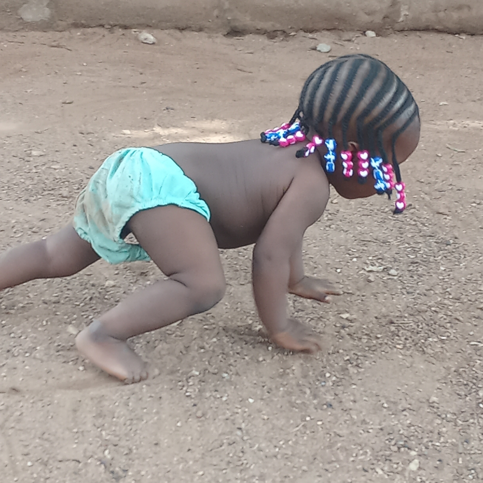 A young child crawls on all fours on a dirt surface. The child, who has dark skin, wears a light blue diaper. The child's hair is styled in cornrows with colorful beads at the ends. The background is…read more