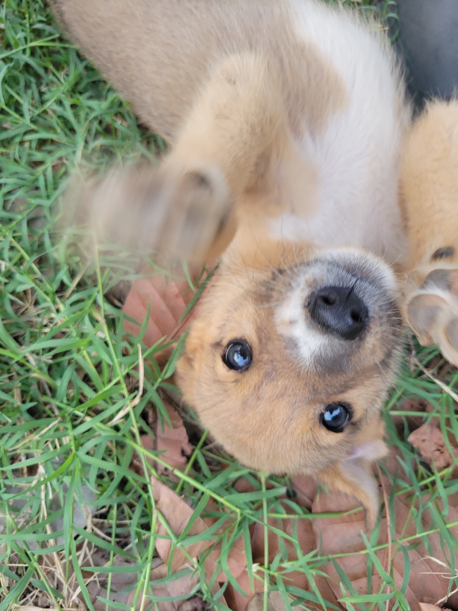 A close-up, high-angle shot captures an adorable light brown puppy lying on its back amidst green grass and scattered dried brown leaves. The puppy, likely young, has soft, light brown fur with whiteβ¦read more