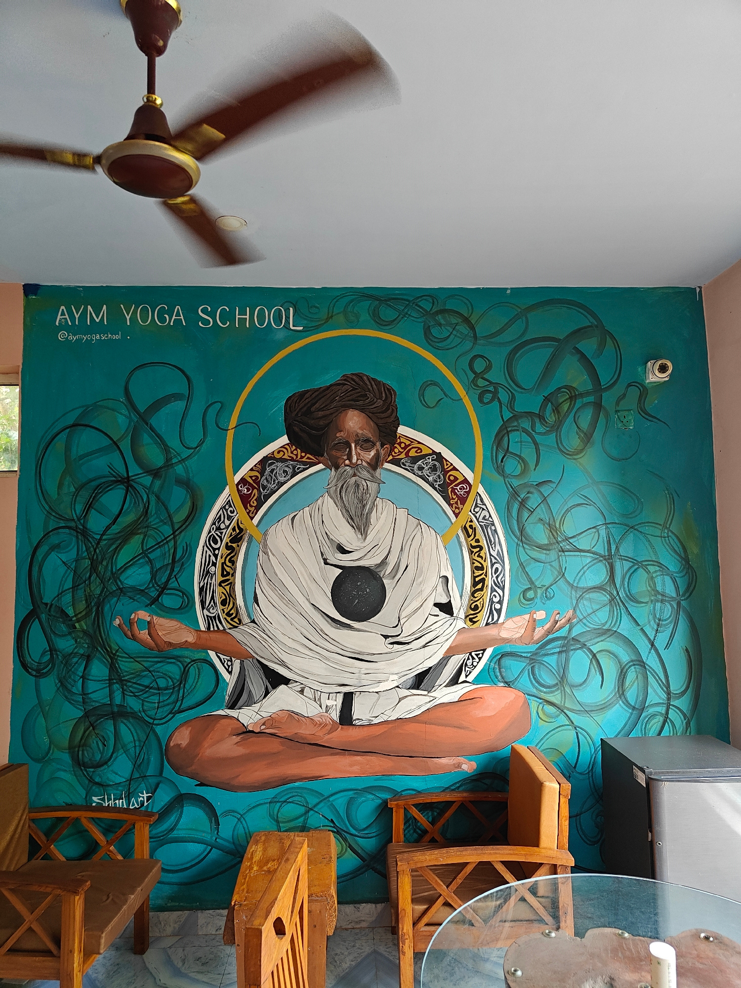 The image captures a scene in what appears to be a yoga studio, specifically the "AYM YOGA SCHOOL" in Arambol, India, as indicated by the text painted on the wall. The main subject is a mural of an o…read more