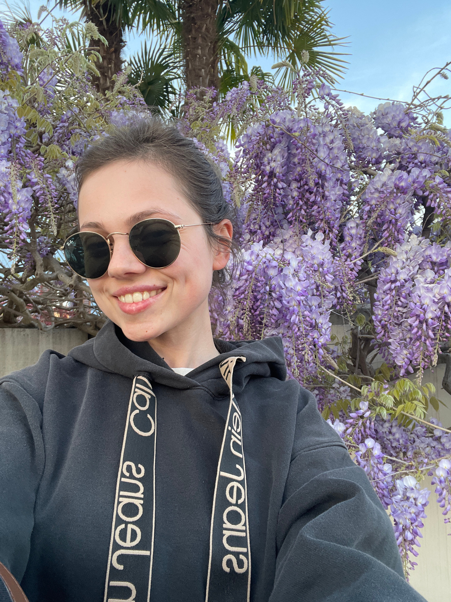 A smiling woman in a black hoodie and round sunglasses poses with wisteria and a palm tree. The location is possibly Case/Scjasis, Italy.