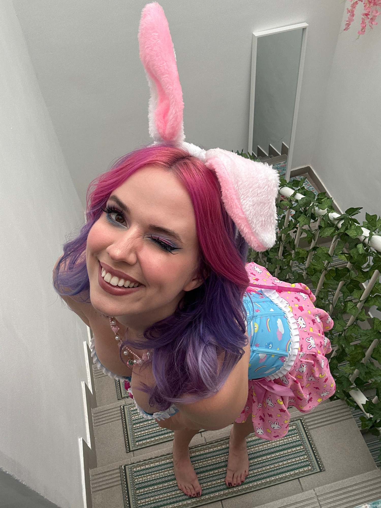 A woman with pink and purple hair, wearing bunny ears and a pink dress with unicorns and moons on it, is smiling and winking at the camera. She is standing on a rug on a set of stairs, with plants in…read more