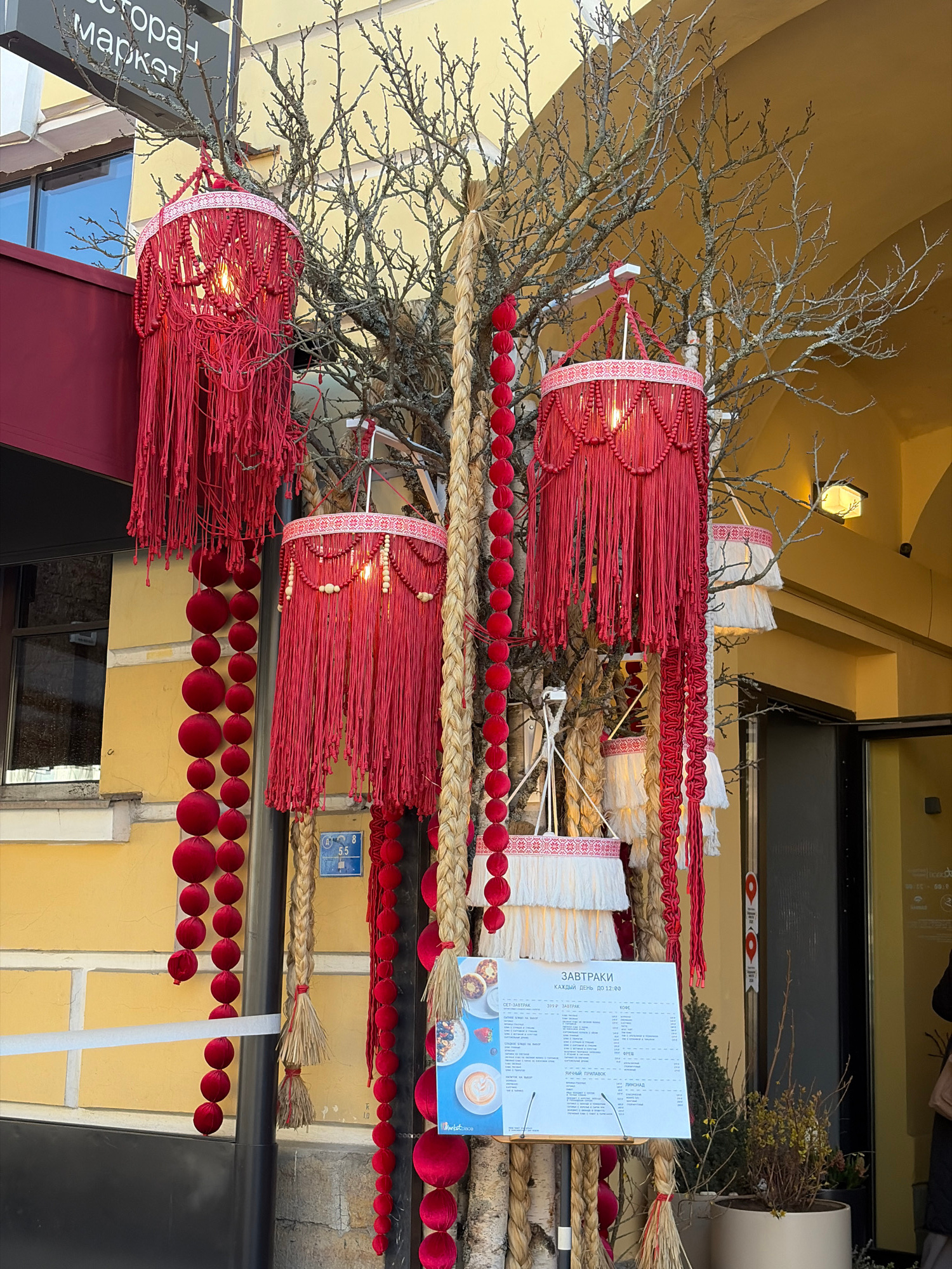 This image captures a vibrant and rustic outdoor decoration for what appears to be a restaurant or market in Saint Petersburg, Russia. The scene is dominated by three large, cylindrical decorations, r…read more