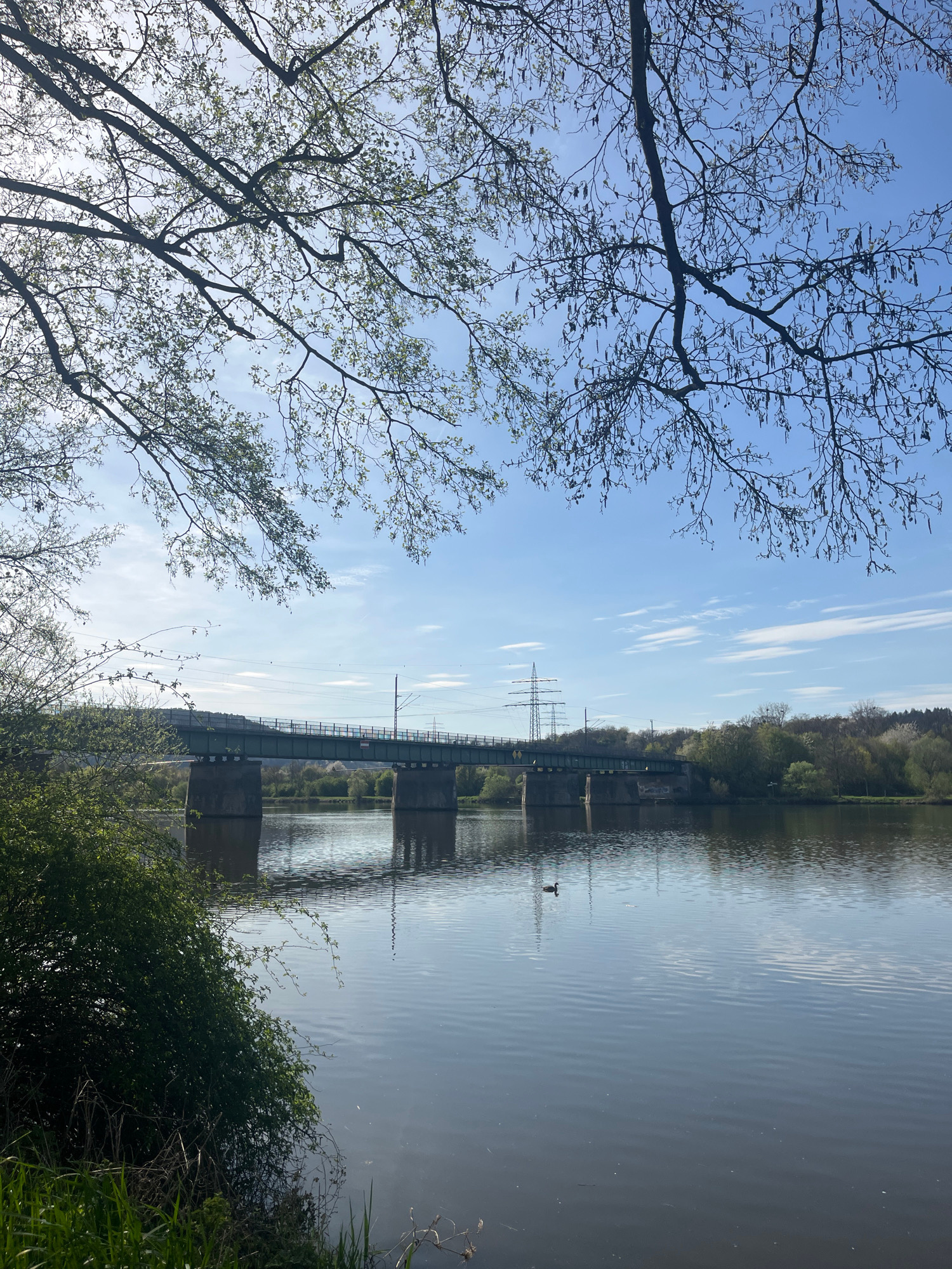 The image shows a bridge over the Saar River in Konz, Germany. The river is calm with a few ripples. Trees line the banks on either side of the river. The bridge is made of metal. Power lines run next…read more
