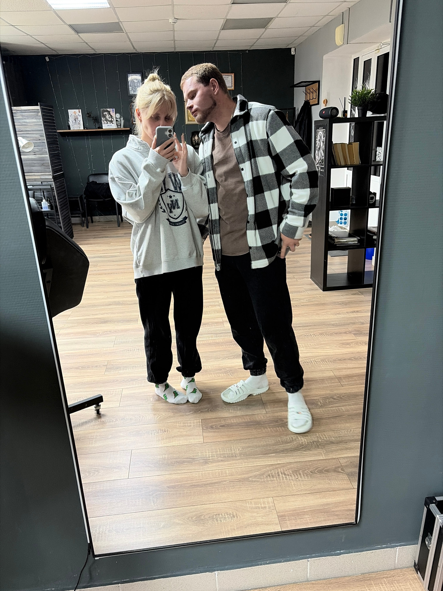 A selfie is taken in what appears to be a room with light-colored wood-patterned flooring and dark gray walls. The reflection in the mirror shows two people: a man with blonde hair and a woman with bl…read more