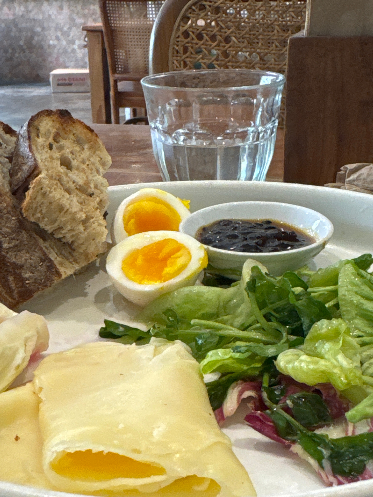 The image shows a plate with a salad, boiled eggs, bread, and a small bowl of sauce. A glass of water is next to the plate on a wooden table. A wicker chair is visible in the background. The image was…read more