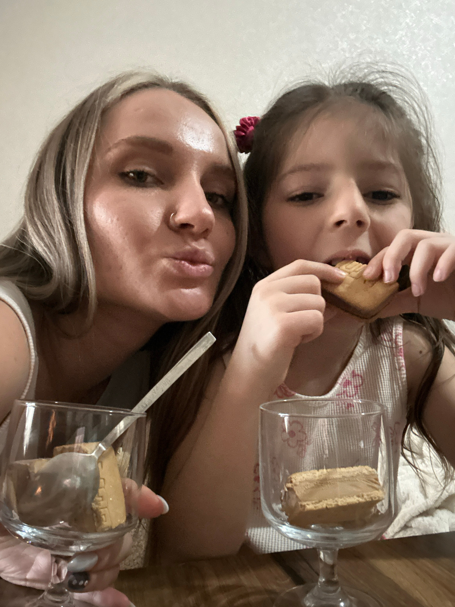 An indoor, close-up image taken in Esenyurt, Turkey, depicts two individuals, an adult female and a young female child, consuming desserts. The adult female is positioned on the left, closer to the caβ¦read more