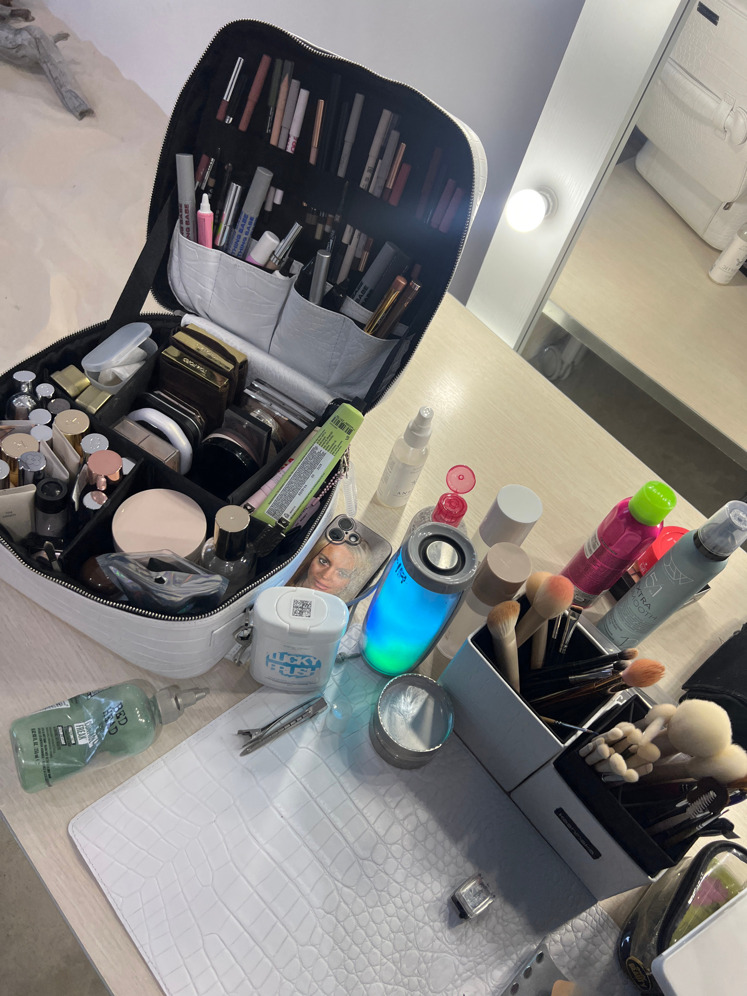 An overhead, slightly angled shot reveals a collection of beauty and grooming products spread across a light-colored wooden or laminate countertop. The scene appears to be a vanity or dressing area, w…read more