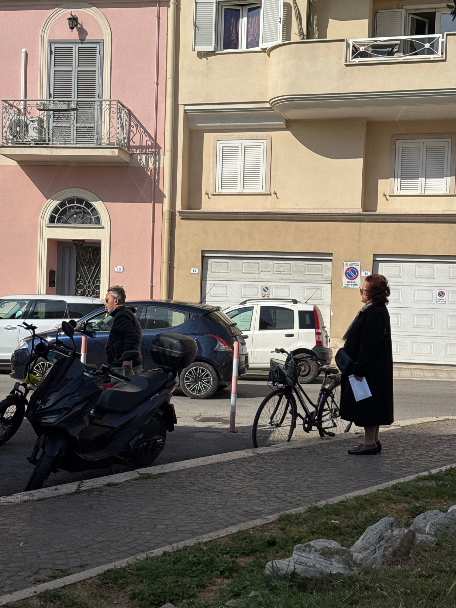 The scene shows a street in Nettuno, Italy, with buildings on the left side of the frame. Two people are visible; one is a senior woman in a dark coat walking with a bicycle, and the other is a man st…read more