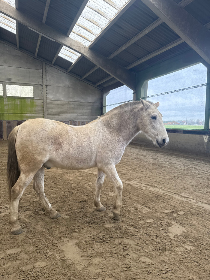 An indoor equestrian arena located in Estaimpuis, Belgium, is depicted. The scene features a single light grey or fleabitten roan stallion, positioned in profile and walking towards the right of the fâŚread more