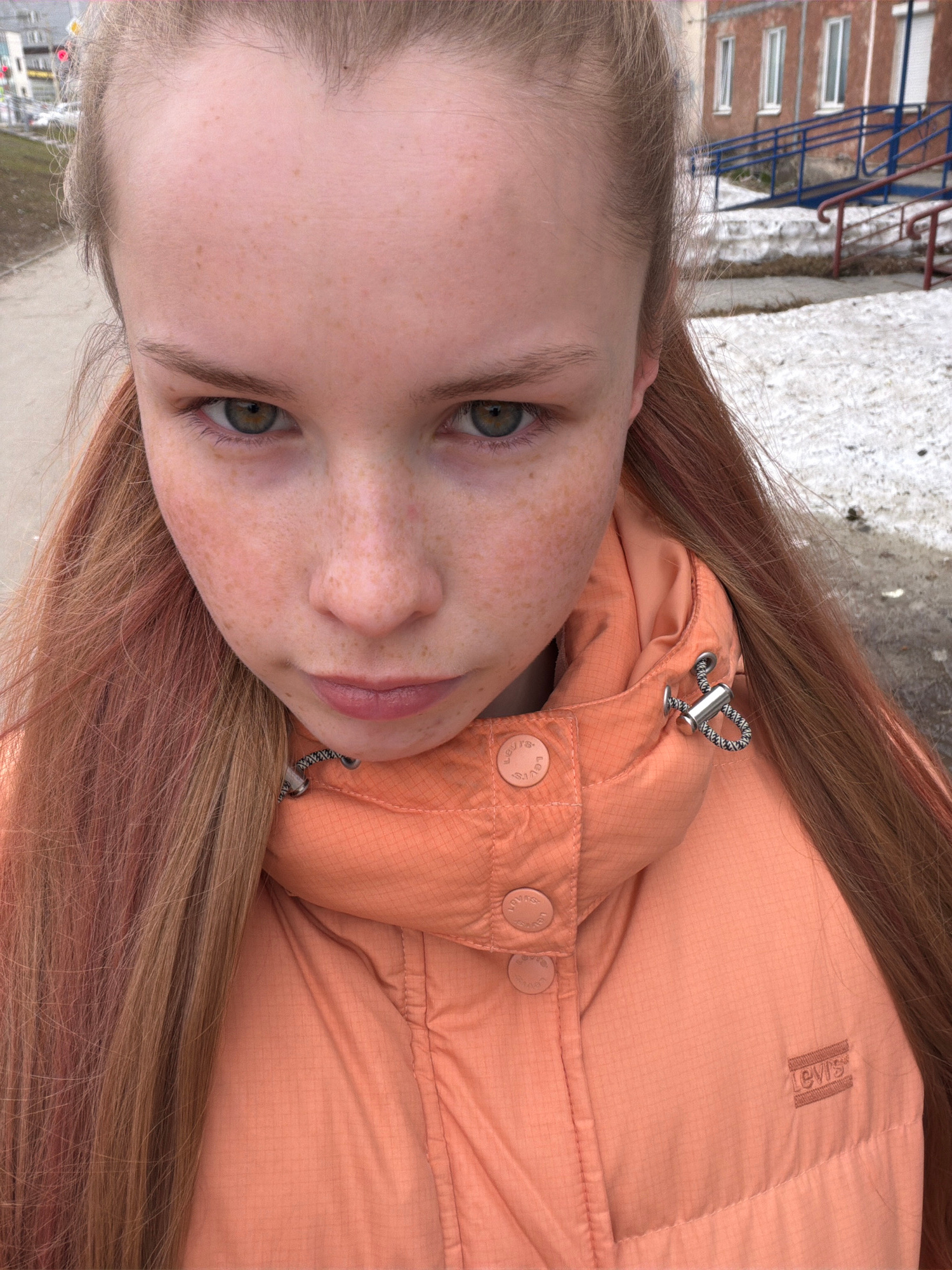 A young, fair-skinned woman with freckles and light-colored hair with reddish highlights is the focus of the image. She gazes directly at the viewer. She wears a coral-colored Levi's puffer jacket wit…read more