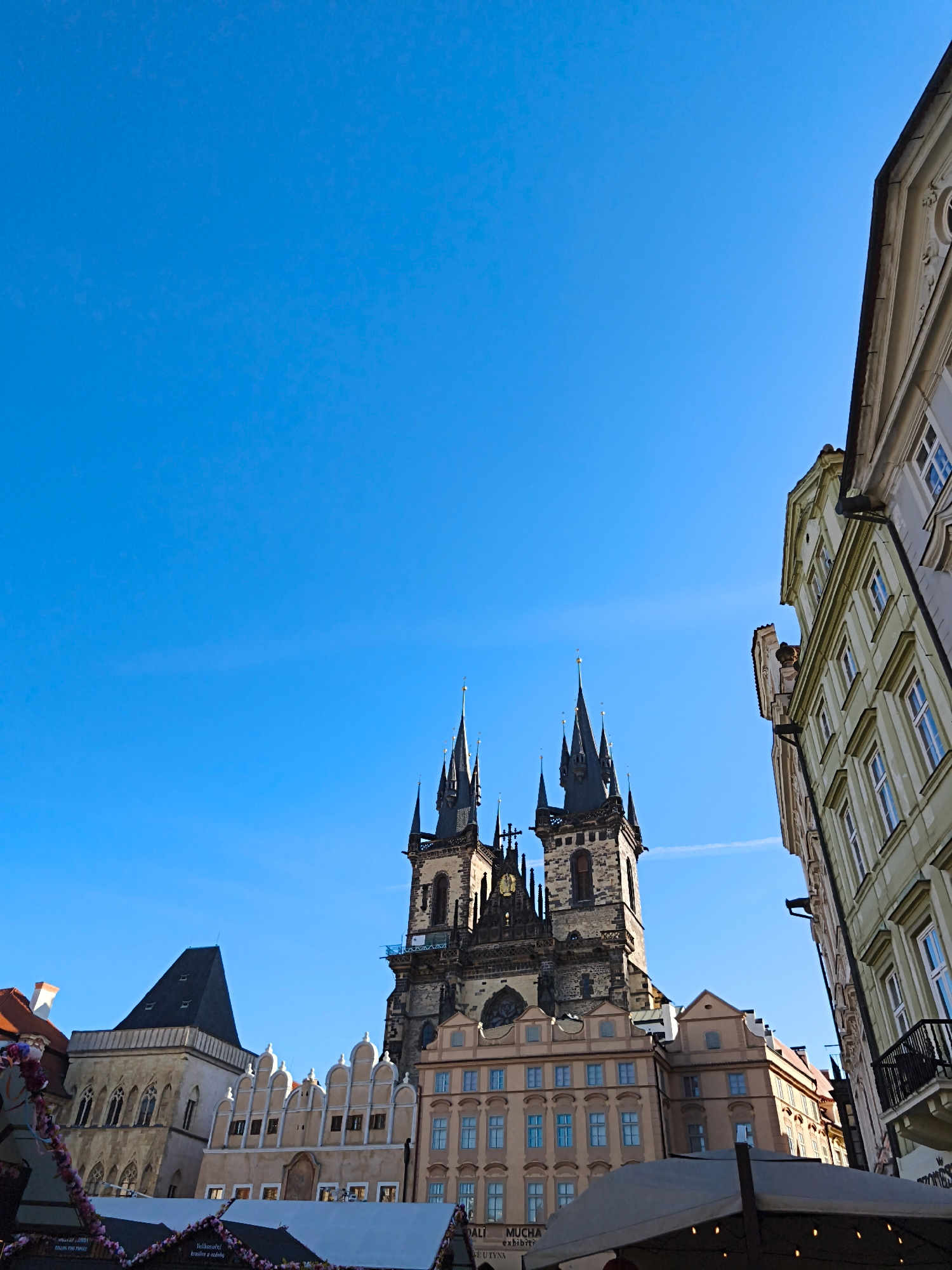 The image captures a low-angle view of the Church of Our Lady before Týn, a dominant landmark in Prague, Czechia. The church's distinctive twin towers are visible against a clear blue sky. The surroun…read more