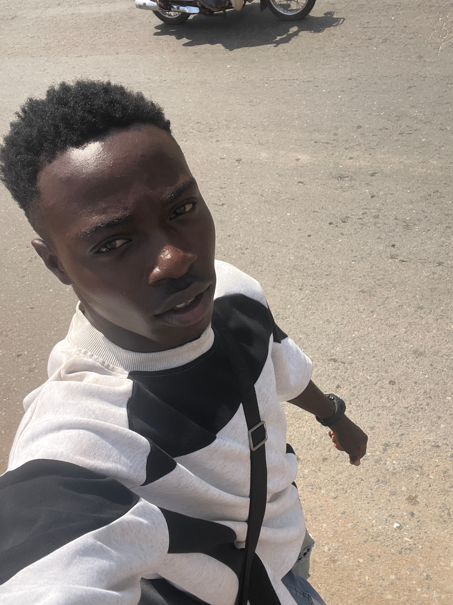 This image, taken in Onitsha, Nigeria, features a young Black man posing outdoors during the daytime. He is positioned against a light grey, textured paved surface, likely a road or sidewalk, with hisβ¦read more