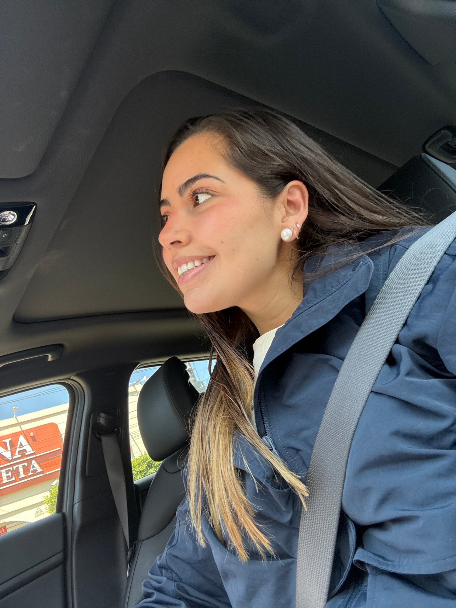 A woman with brown hair and a pearl earring is visible in the front seat of a car. She is wearing a blue jacket and a seatbelt. The interior of the car is black. Through the window, a sign reads "MARIβ¦read more