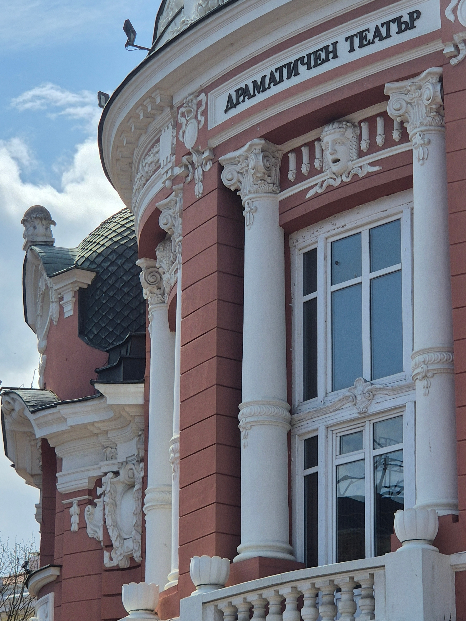 A low-angle shot features a segment of the facade of the "ДРАМАТИЧЕН ТЕАТЪР" (Dramatic Theatre) building in Unknown, Unknown, Bulgaria. Architectural details visible include white columns with decorat…read more