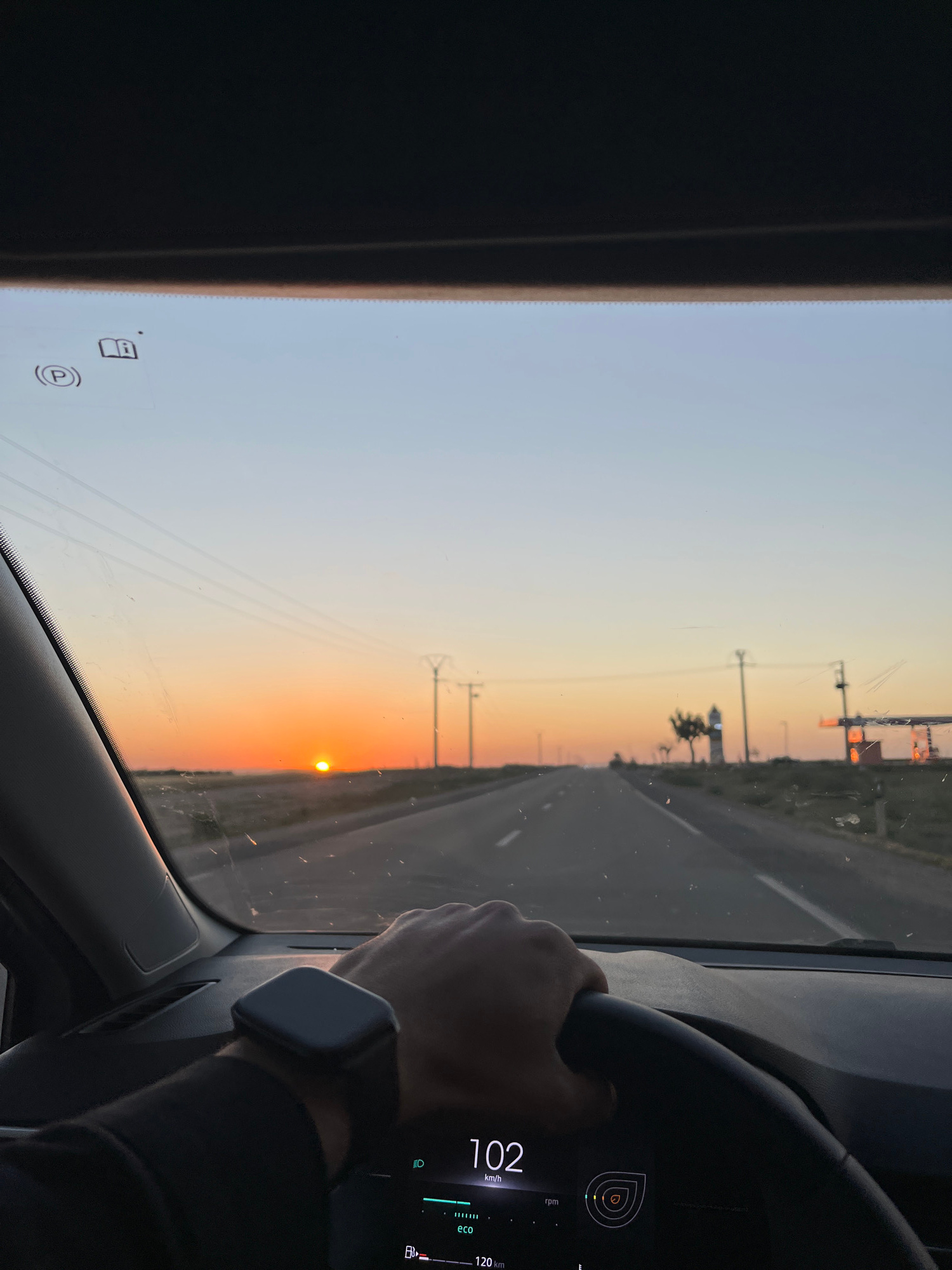 A person is driving a car on a paved road at sunset. The speedometer reads 102 km/h. The car is in ECO mode. The driver is wearing a smartwatch. Power lines and utility poles are visible along the roa…read more
