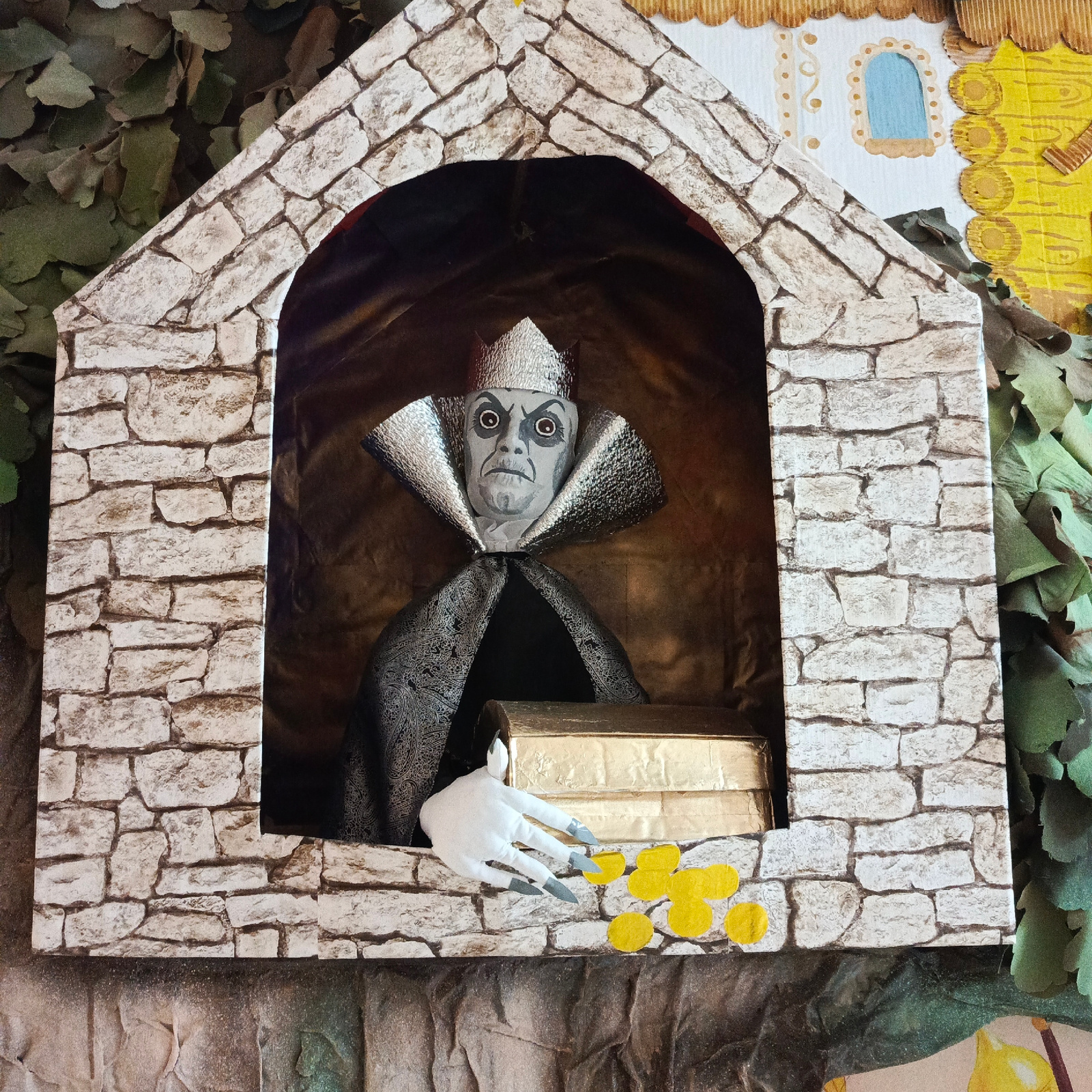 The image shows a handmade diorama of a scene featuring a sinister-looking character in a stone structure resembling a castle facade. The figure is gray-skinned with a silver crown and a wide, pattern…read more