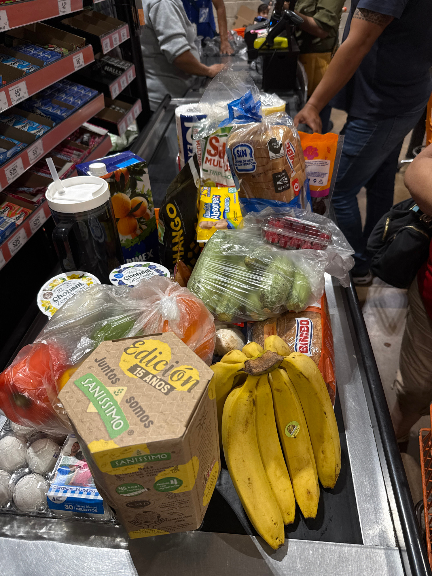 A grocery store checkout line in Veracruz City, Mexico displays a variety of food items on the conveyor belt. These include a bunch of bananas, Bimbo bread, a box of Sanissimo brand tostadas, a packag…read more
